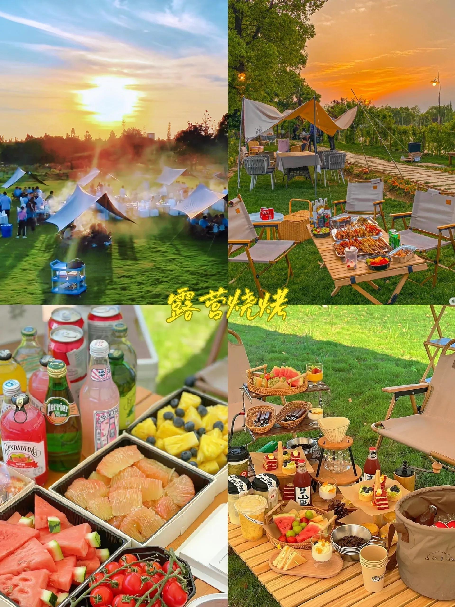 傍晚时分,可以选择露营烧烤。以天空为台,青山为幕,草地为席,与三五好友围坐聊天,享用滋滋冒油的烤肉,配上小酒,所有的坏心情和疲惫都会烟消云散。