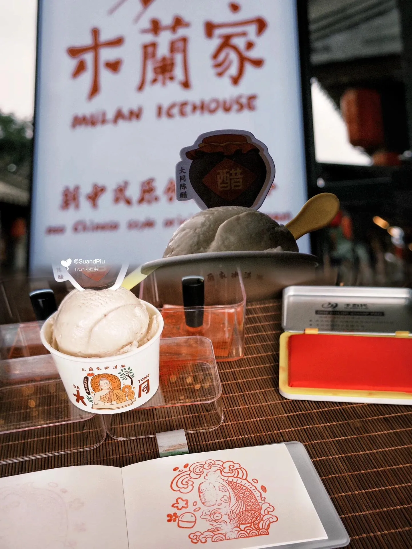 木兰家冰淇淋店提供2个免费的亚克力章,是一组精美的鸱吻图案。大同市旅游集散中心门口的桌上有5个免费的光敏章,是大同建筑章,细节清晰。