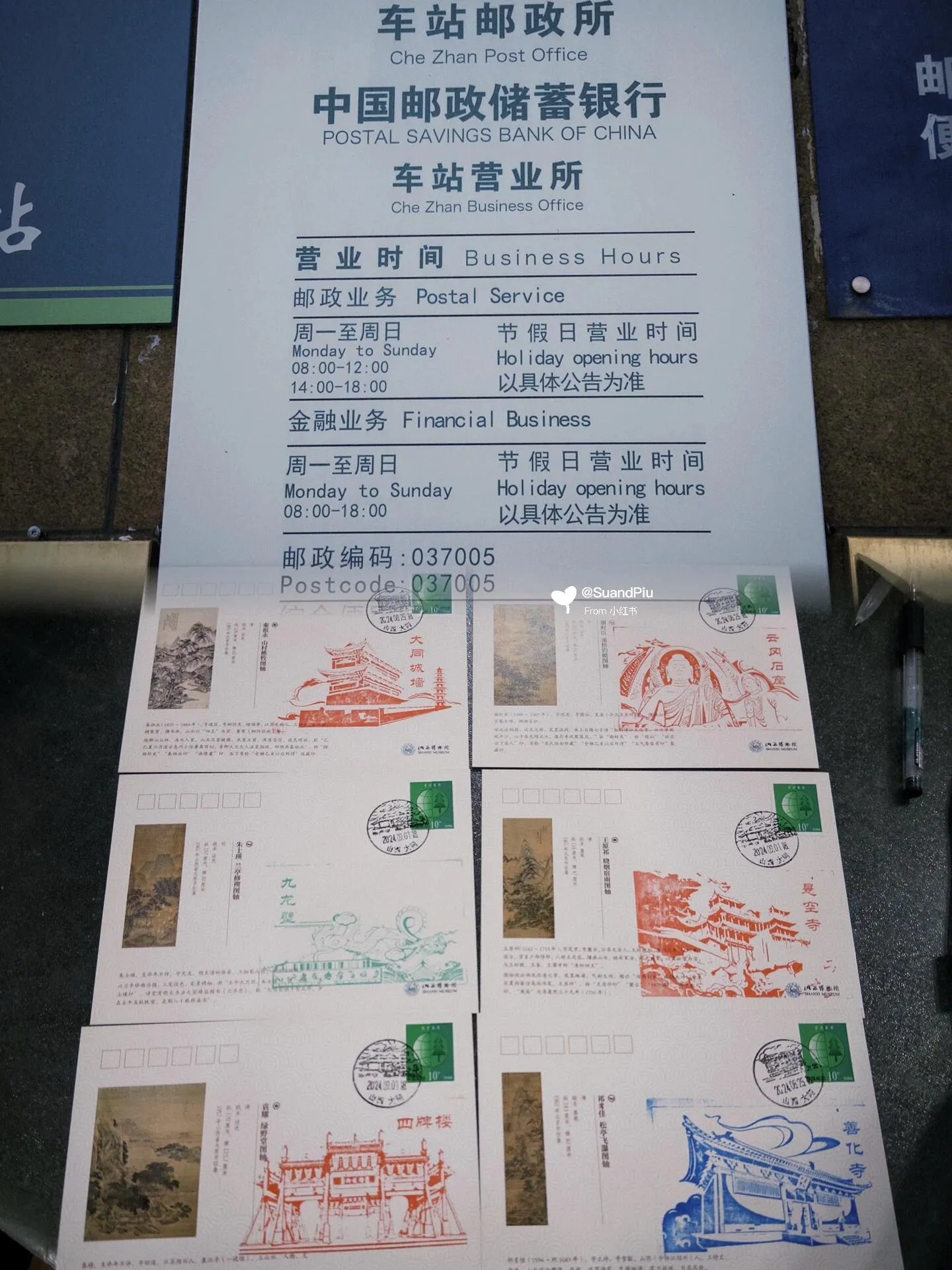 车站邮政所提供2个免费的风景戳(九龙壁和华严寺)以及1个日戳。开化寺的纪念品商店则有更多选择:15元可盖1份地图章,2组付费的套色章(左右门神),以及19个光敏章。