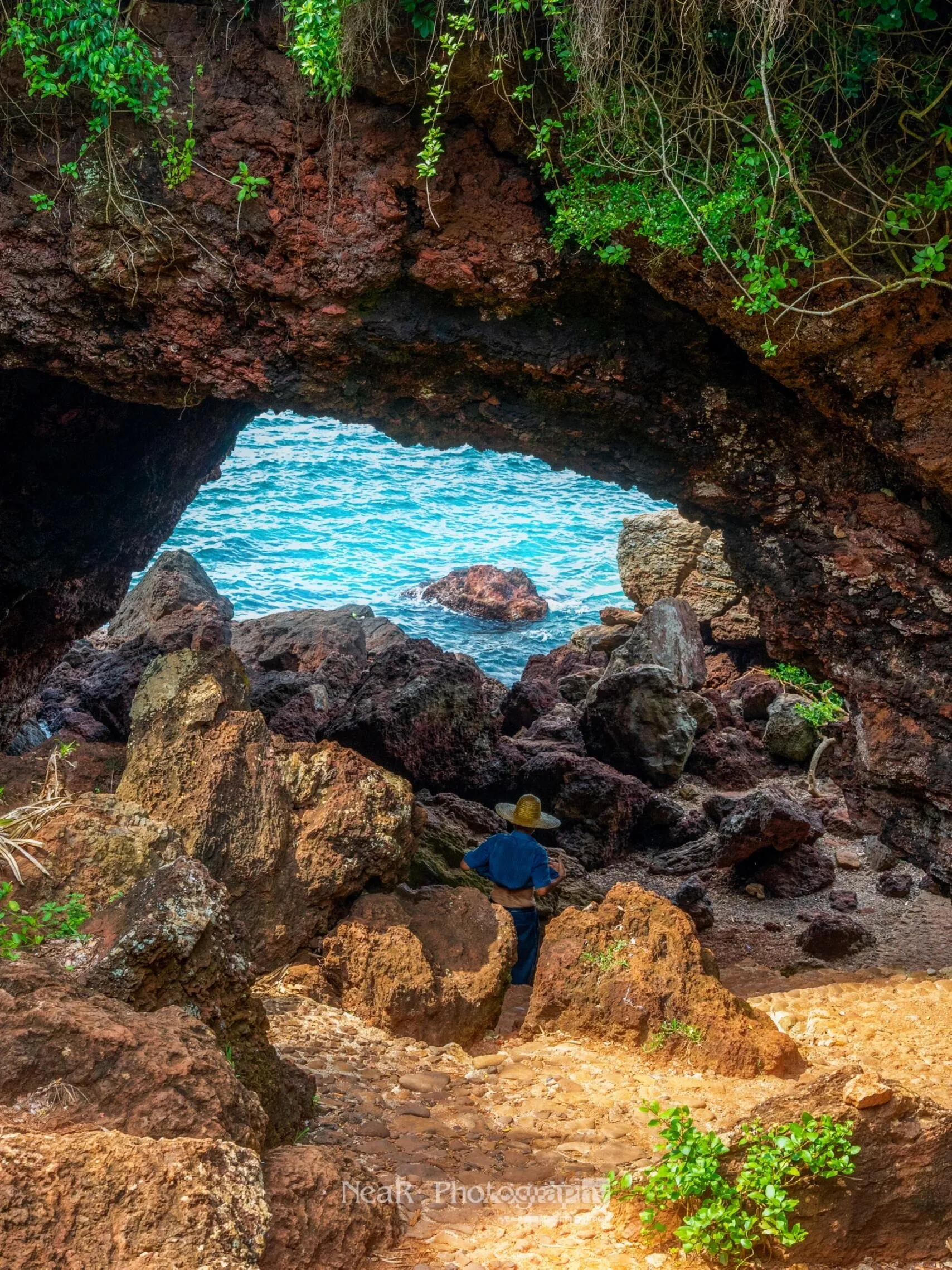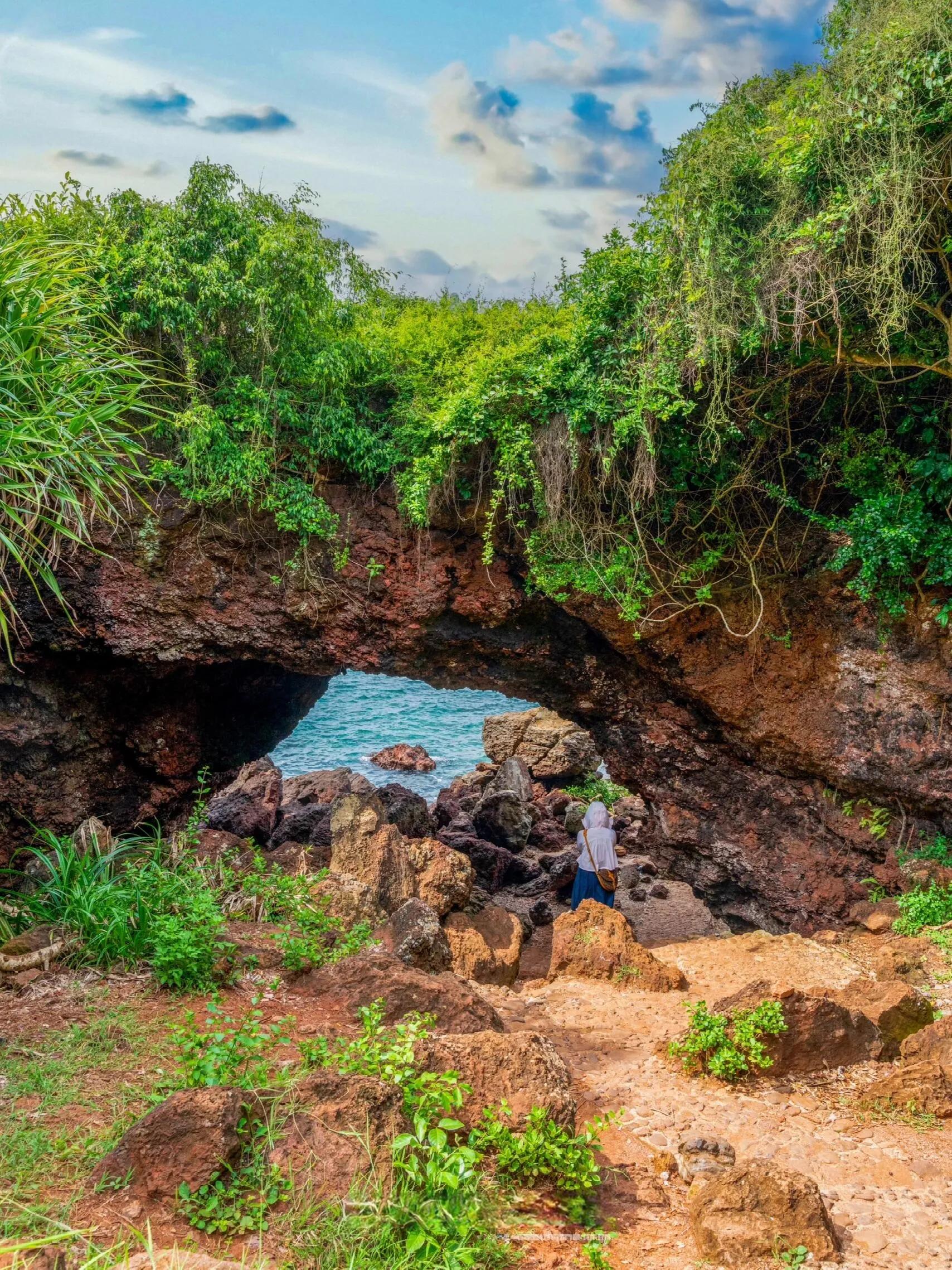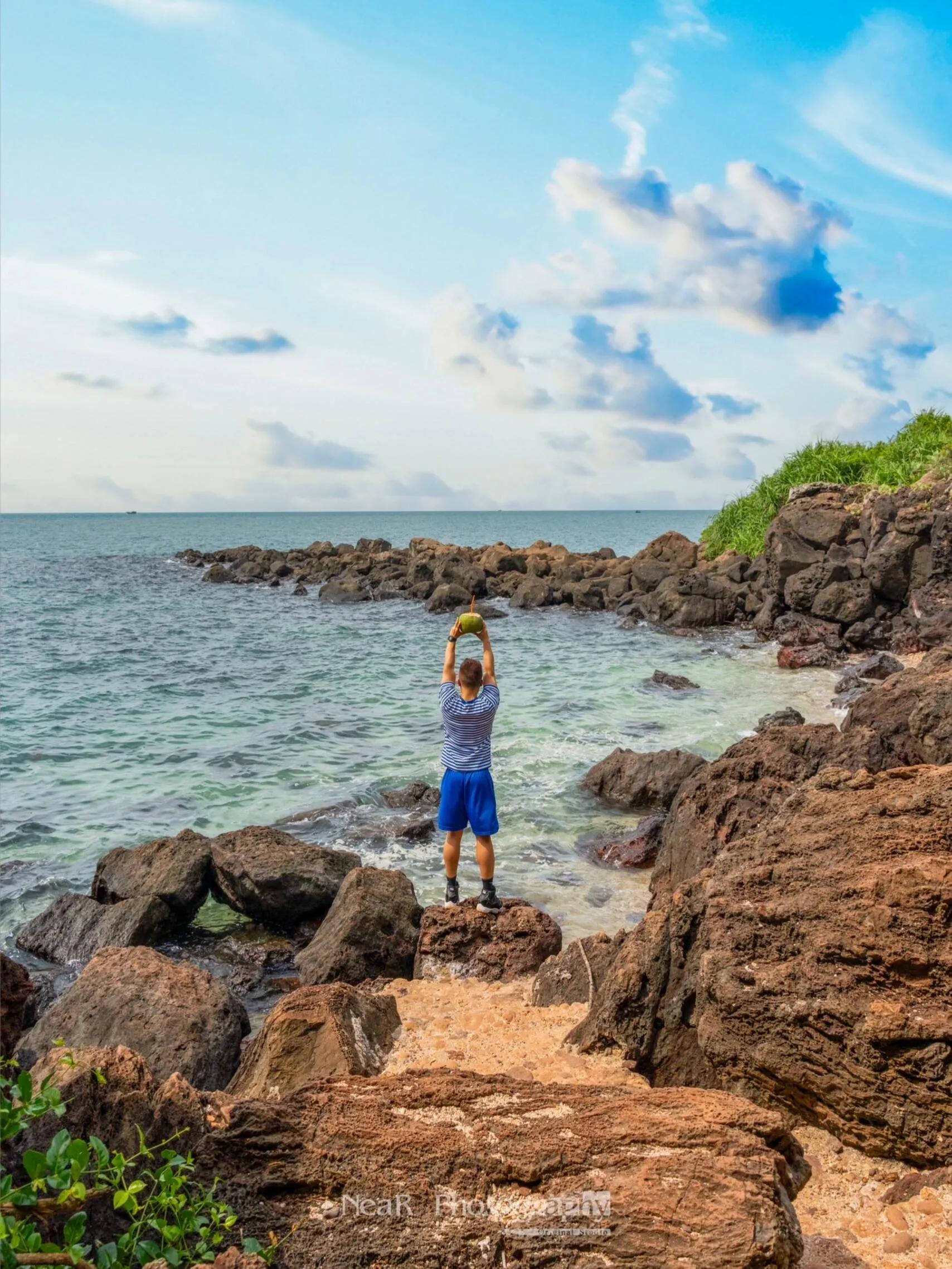 海南自驾环线中, 峨蔓镇火山海岸省级地质公园 是一个不容错过的景点。其中, 龙门激荡最为出名。 沿着“龙门激浪”的指示牌往下走,可以看到一个拱形石门。海滩边的岩石嶙峋、嵯峨、错落、峻峭,呈现出独特的火山岩地貌。