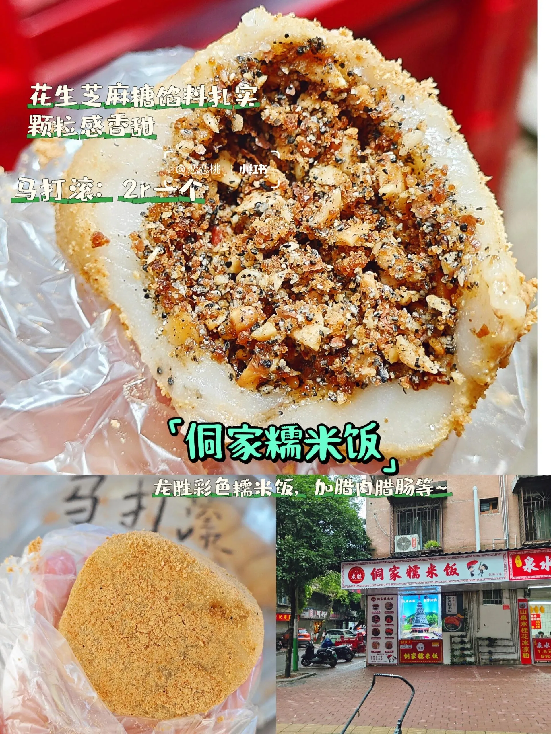 侗家糯米饭提供龙胜彩色糯米饭 ,搭配腊肉腊肠等,展现了少数民族的特色美食。值得一提的是马打滚,类似水糍粑但皮子更厚实有嚼劲,花生芝麻馅香甜可口。