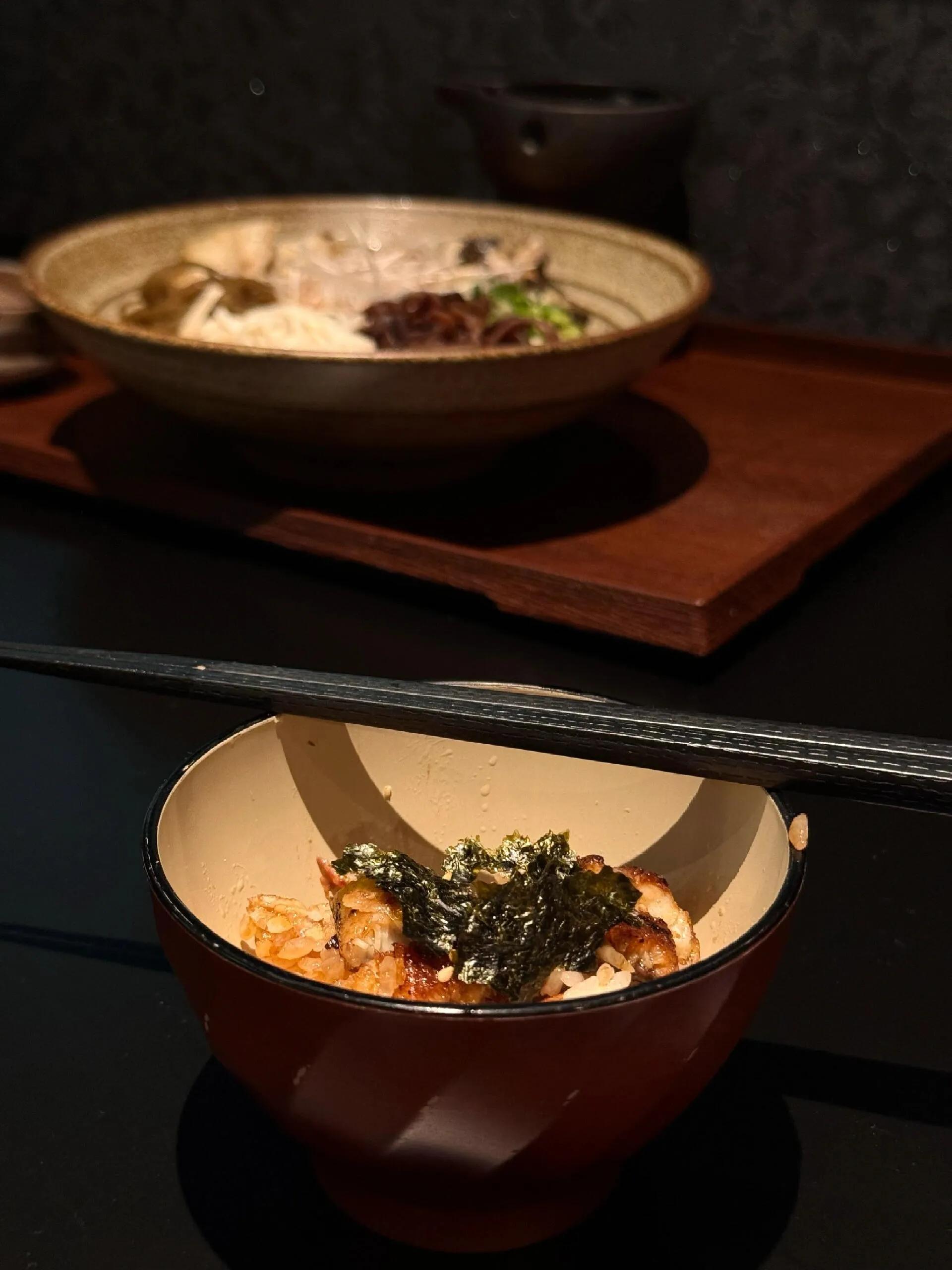 DAN Kitchen·鳗鱼饭位于新源街63号103D一层 (MR.DANDY 西侧),营业时间为周二至周日11:30–14:00。 这里的蒲烧鳗鱼饭堪称北京最佳之一 ,份量十足。鳗鱼的鲜香与锅巴饭的焦香完美融合,口感丰富却不腻。配菜也十分用心,尤其是紫苏桃子Q和酥脆的炸鱼骨。白烧鳗鱼面则相对清淡,搭配的黄喉别具特色。店铺环境也很讨喜,满目绿植的落地窗营造出近似京都的深绿氛围。整家店从菜品到格局和氛围都非常统一,给人一种独特的“空间”体验。