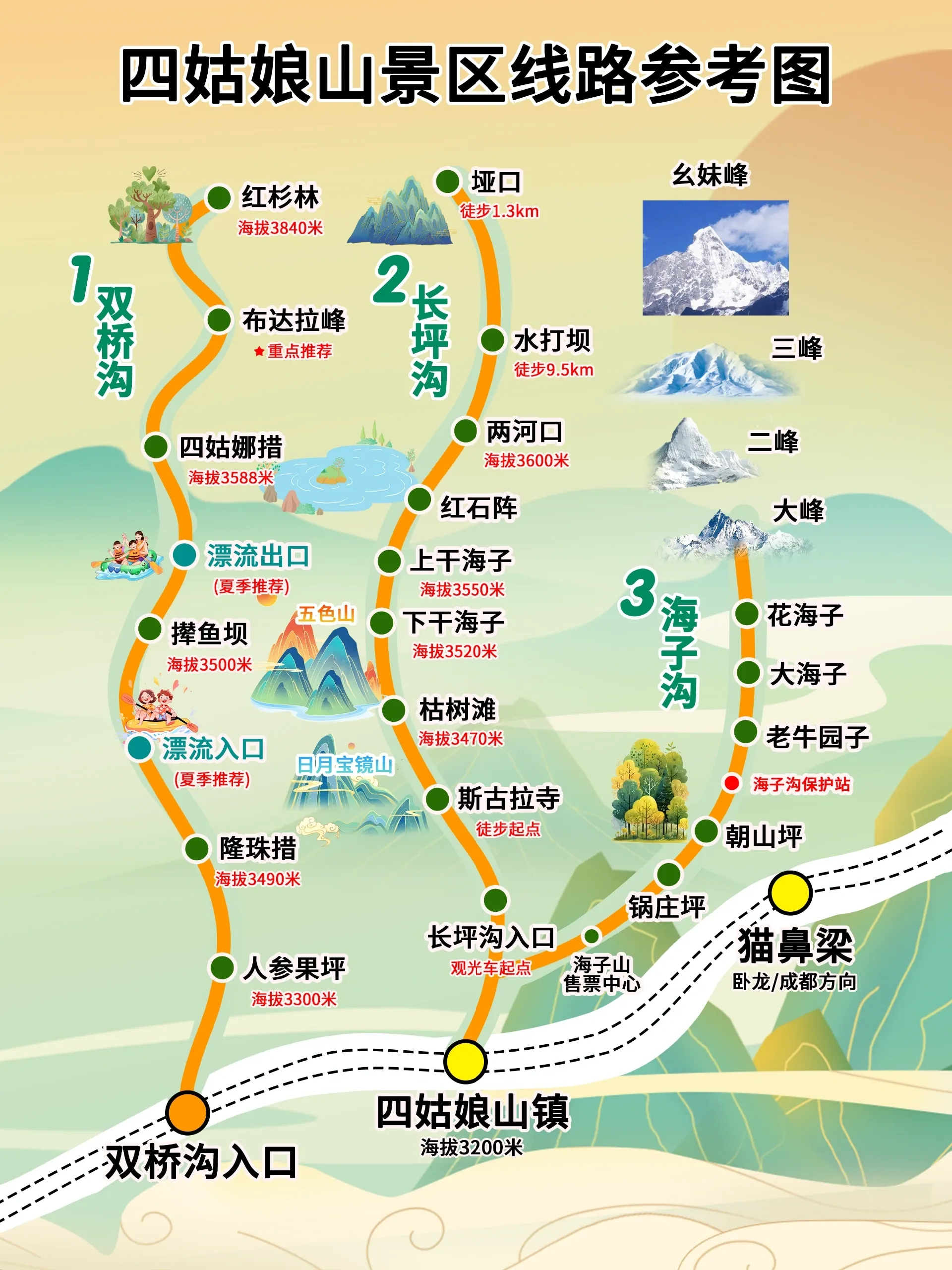 双桥沟景区主要以雪峰、牧场、草地、森林、溪流等为主,是四姑娘山三条沟中景致最佳的一条。景区内分三段,已开发二十多个景点,可观看到十几座海拨4000多米以上的雪山。