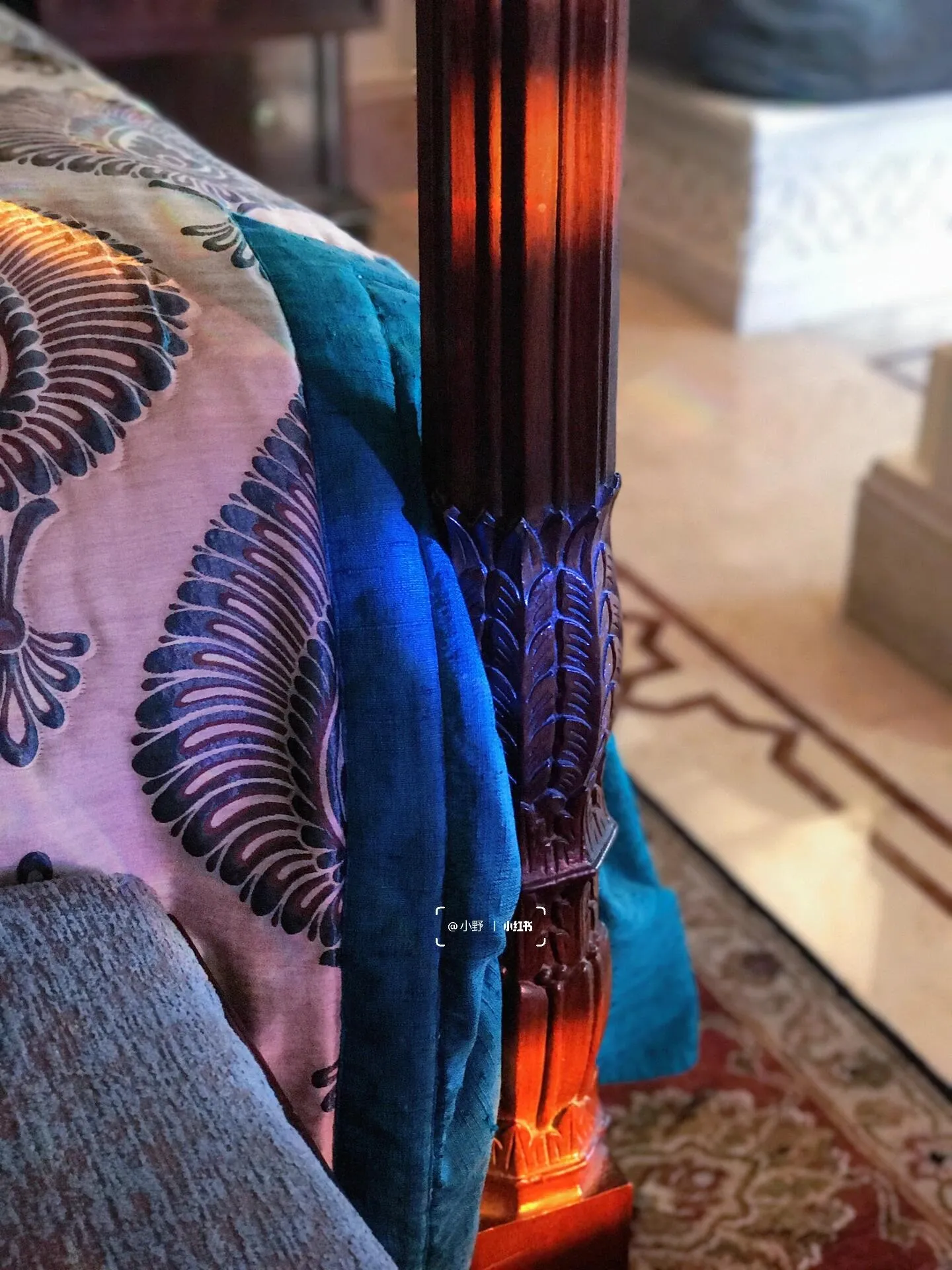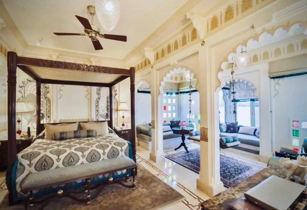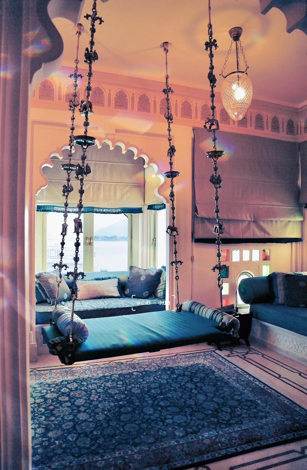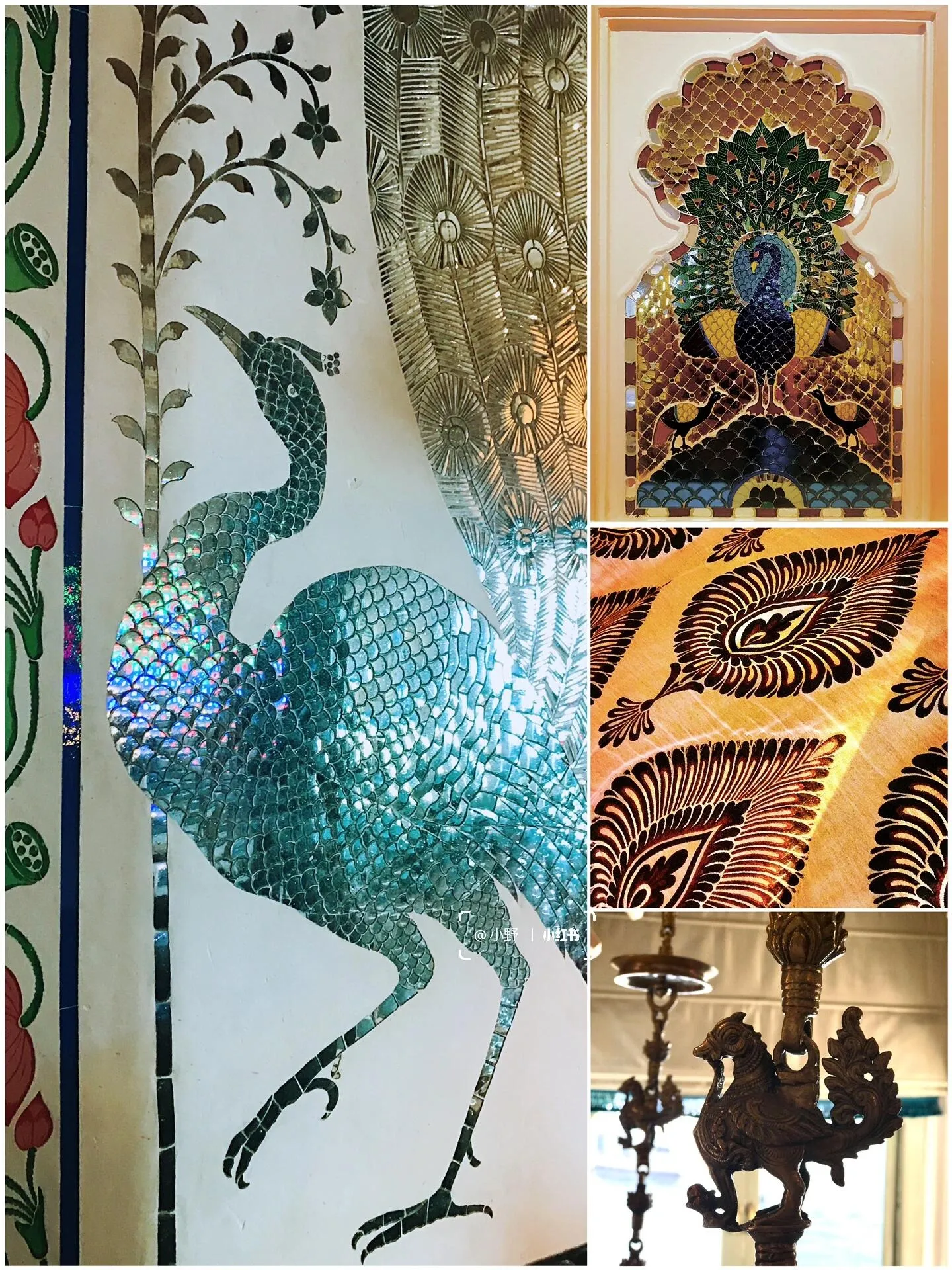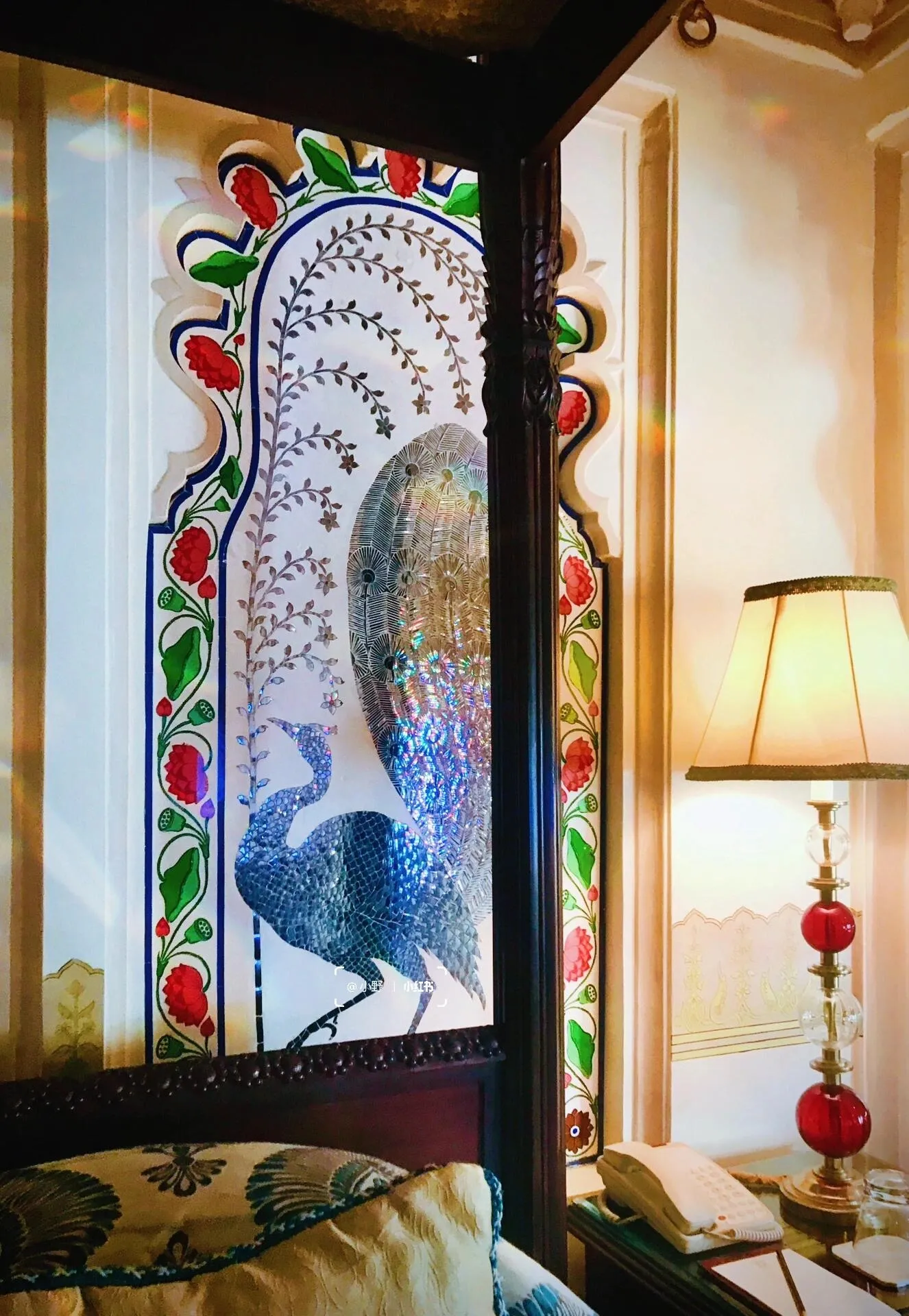 管家兴奋地说为我们准备了“something special”。穿过曲折的回廊,光影交错,大理石地面干净得像另一个世界。套房是错层结构,起居室、卧房、洗手间布局合理。墙壁上贝壳镶嵌的孔雀、印度皇宫标志性的吊床、蓝绿色的室内陈设,处处彰显“孔雀主题”,与乌代布尔“印度孔雀王朝”的辉煌相得益彰。