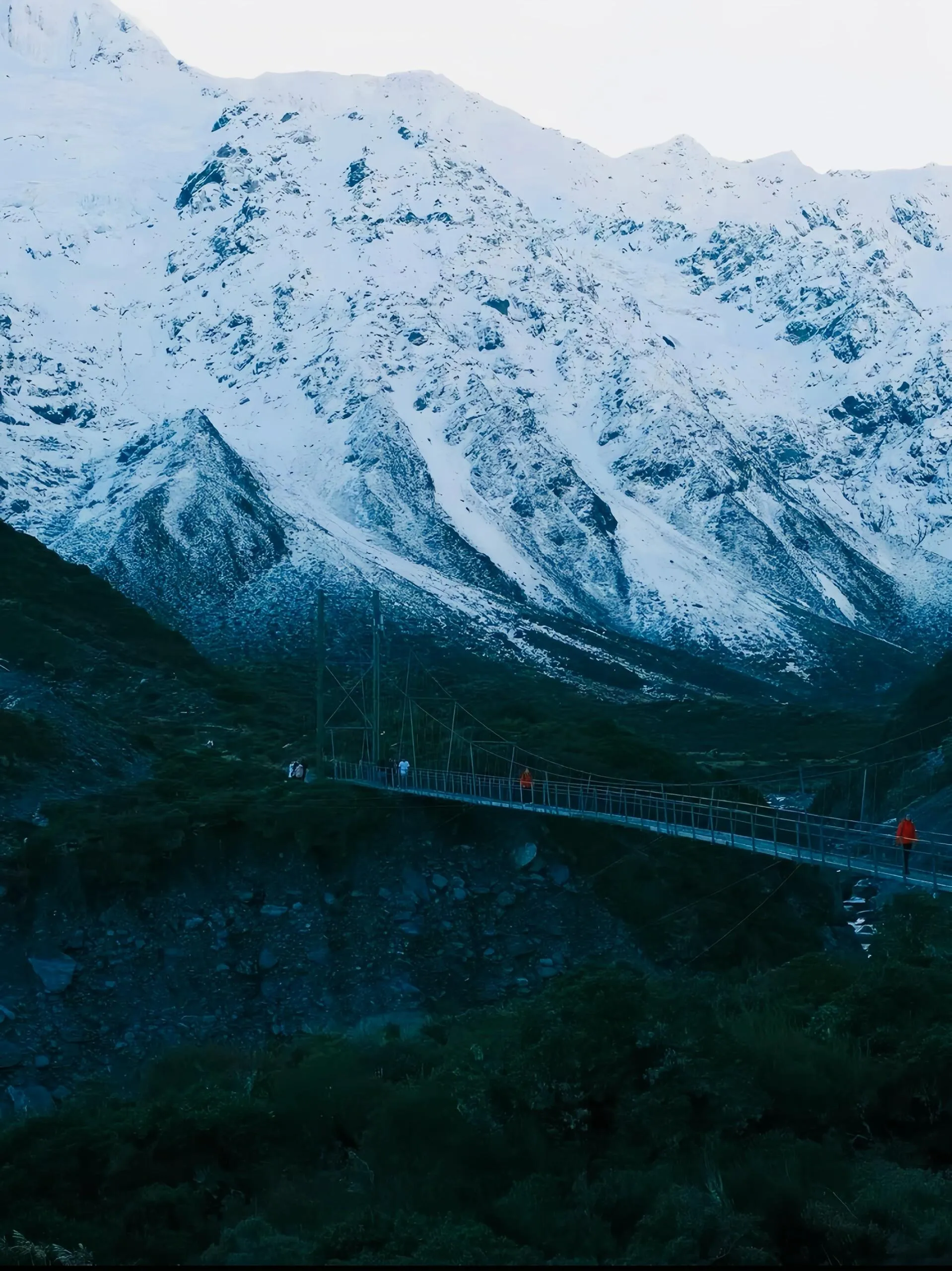 胡克步道则是一条较为小众的徒步路线。单程需要约1.5小时,往返大约3个多小时,相对较为费力。这条步道途经库克山西侧,沿途可欣赏到壮丽的冰川美景。路线上有3座吊桥,每座吊桥都能欣赏到不同的景观:第一座可以看到冰川融水的溪流,第二座可以看到库克山主峰,第三座则可以直接面对冰川。胡克步道的起点在白马山露营地(White House Hill Campsite),那里设有停车场。整条步道全长10公里,沿途没有商店,建议自带水和简单食物。