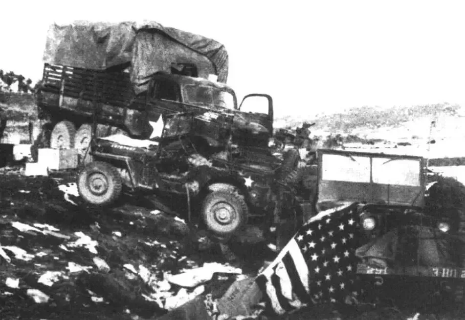 天亮后,美军开来了,先头是3辆10轮大卡车和1辆吉普车。