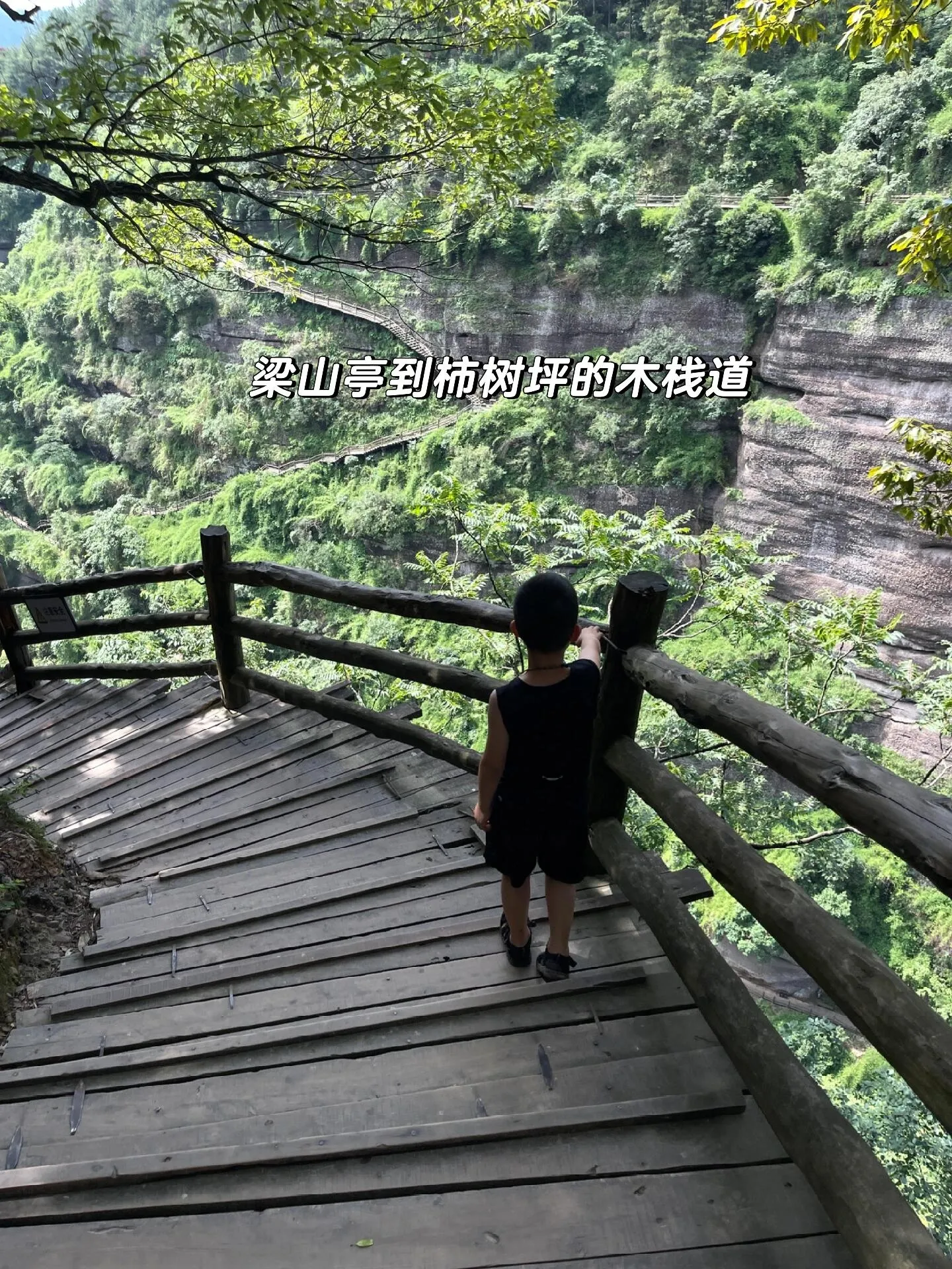我们对登顶没执念,选择了右线路下山。不过虽是下山,但梁山亭到石笋峰这一段木栈道,顶着大太阳走着还是有点吃力。因为修建在山壁边,又是木头的,可能怕脚滑,每格还多钉了一条木条,走起来不是那么顺脚。