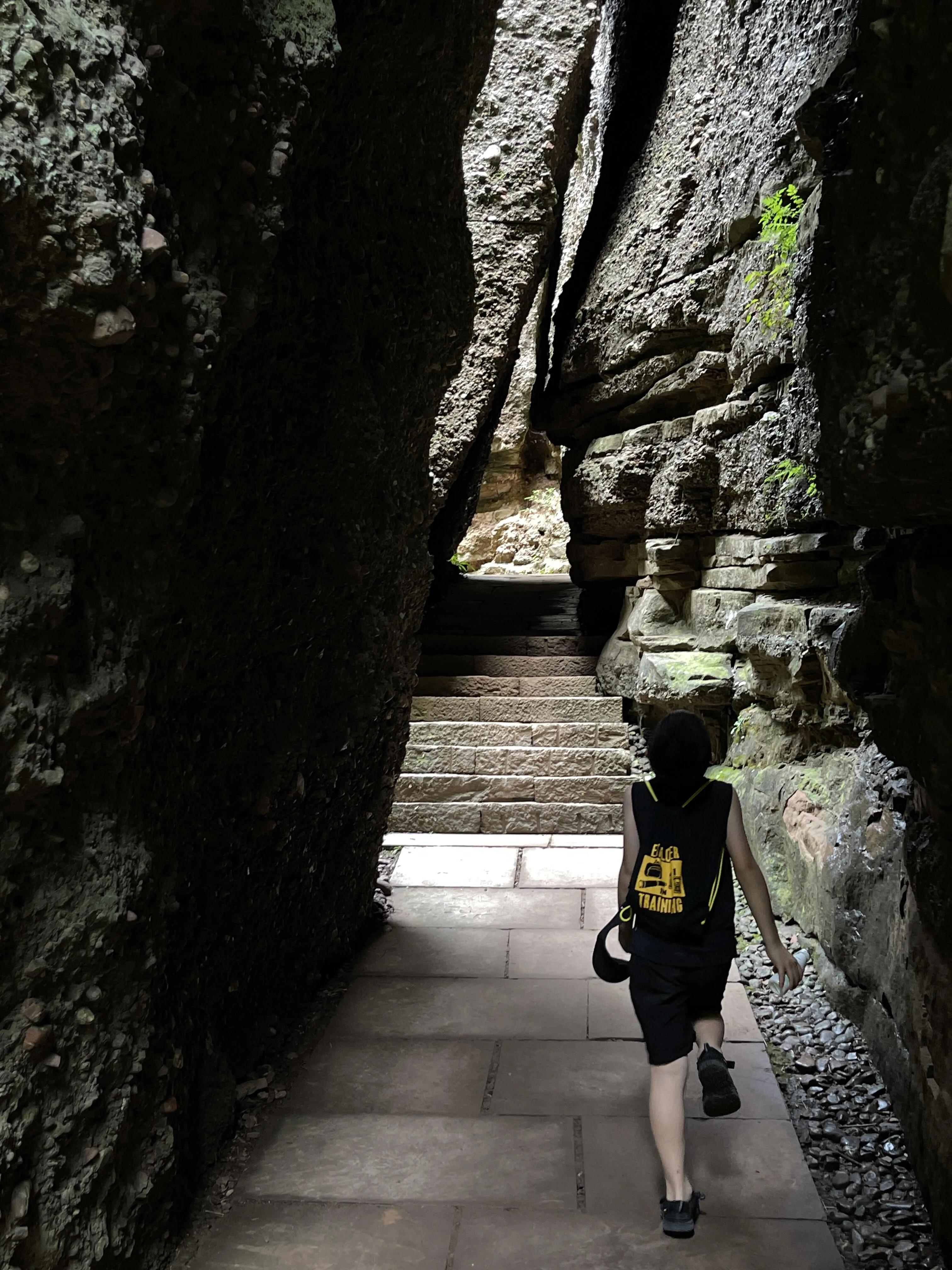 北门进的第一个好处是走不了多久就是缆车站,可以直接坐缆车上仙女廊。到站后可以选择走左边的“ 猿猱道 ”(收费68元)或右边的“ 鸟道 ”。我们选择了“鸟道”。虽然很多人说轻松,但因为天气炎热,对不爱登山的人来说,全是向上的台阶还是很有挑战的。“鸟道”上可以眺望“猿猱道”。