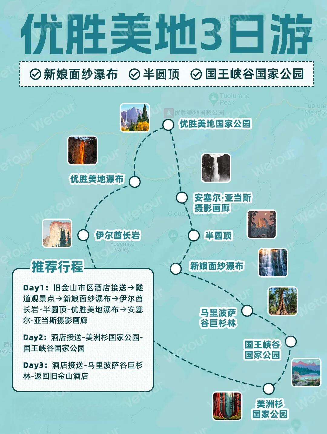 从旧金山出发,探索优胜美地这片如诗如画的土地。 在加利福尼亚州的这片宝地中, 每一个转角都是一幅美景,从波澜壮阔的瀑布到巨大的岩石峰 ,无不展现着大自然的鬼斧神工。