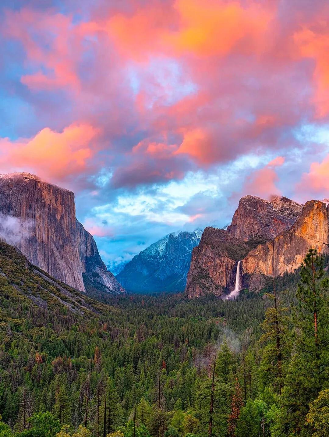 优胜美地瀑布:北美洲最高的瀑布,分为上、中、下三段,它的雄伟与优胜美地的静谧形成鲜明对比,是大自然的奇迹。