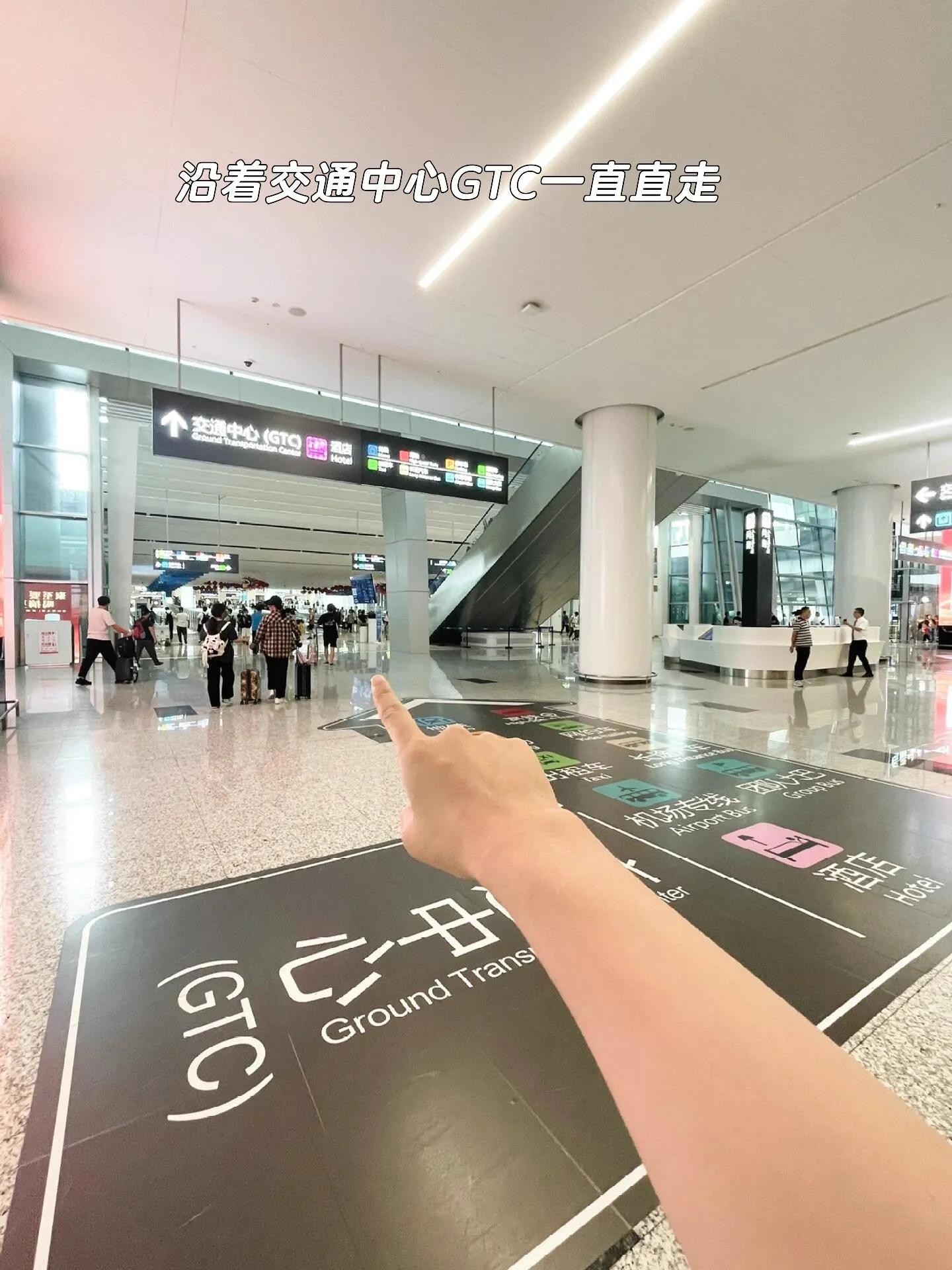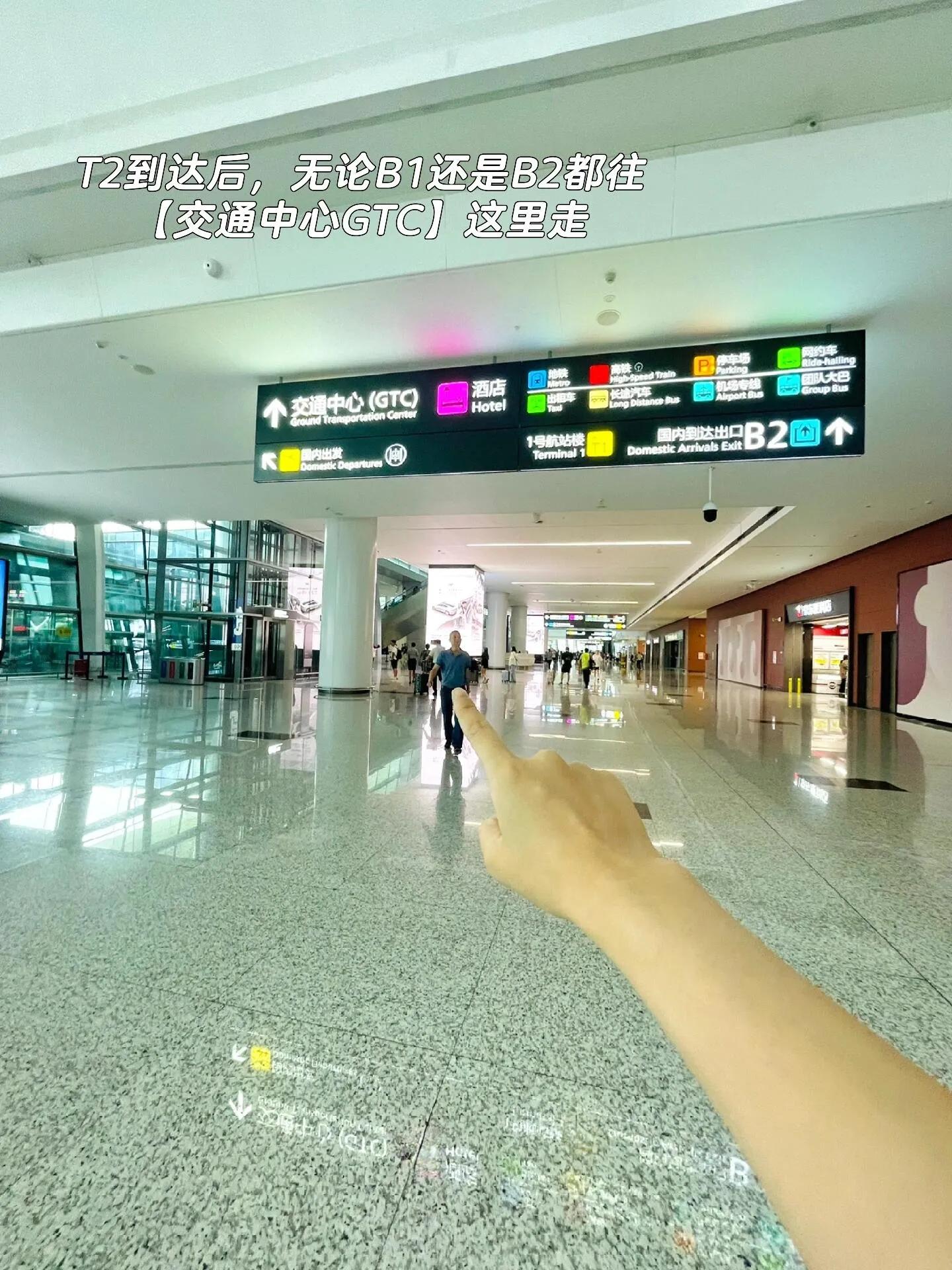 国内T2到达的旅客,无论是从B1还是B2出口,都需要跟随指示牌前往【交通中心GTC】。 进入GTC通道后,沿着通道直行约2-3分钟。
