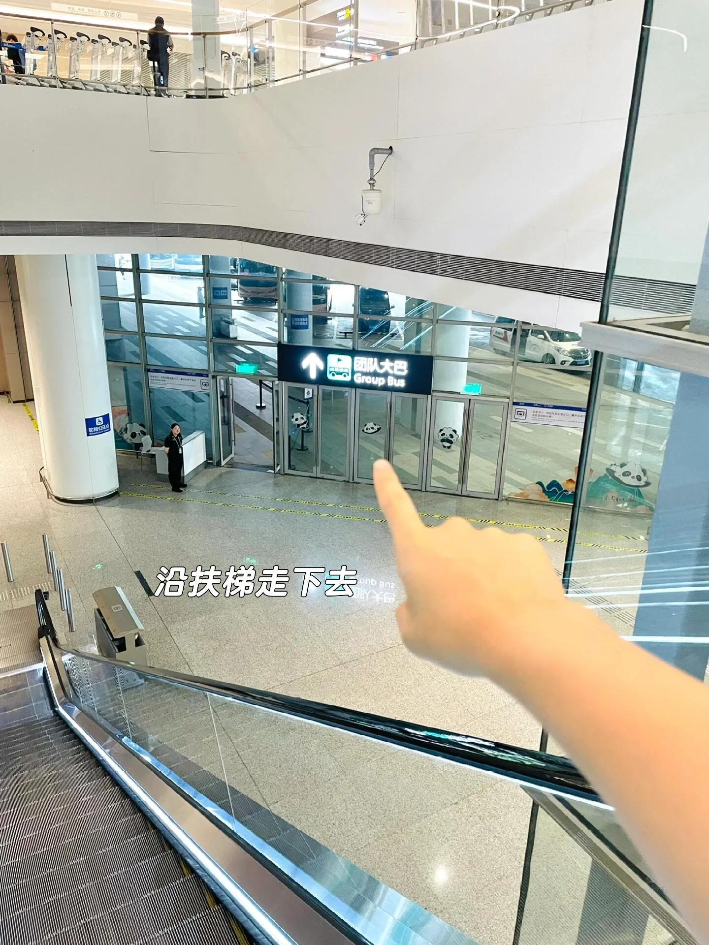 当你看到两个LED广告立柱,旁边有【团队大巴】的标识时,就可以下楼了。 可以选择乘坐手扶梯或电梯。