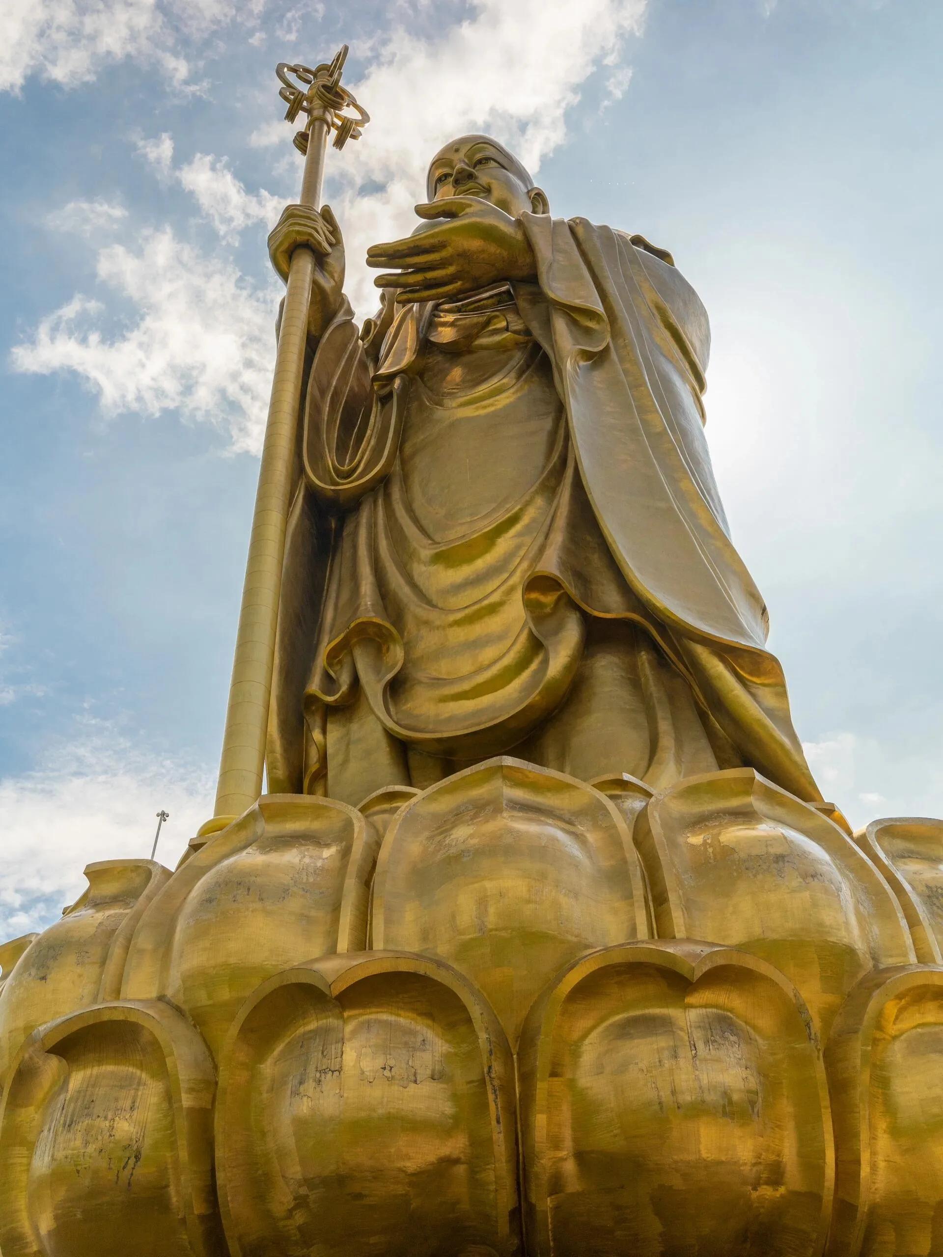 这里16:15闭园,需要乘坐往返接驳车(30元),15:50结束。游览路线包括:弘愿堂(门票39元,可选择不进)、佛光池、净土莲花、大愿广场、八功德水、涤心莲池,最后是99米高的地藏王圣像。要看地藏王需要爬较长的楼梯。到达顶部后,可以顺时针绕圣像三圈祈福。在右手边有个楼梯,下去后有个小门,进去再爬几层楼梯就能摸到佛脚。