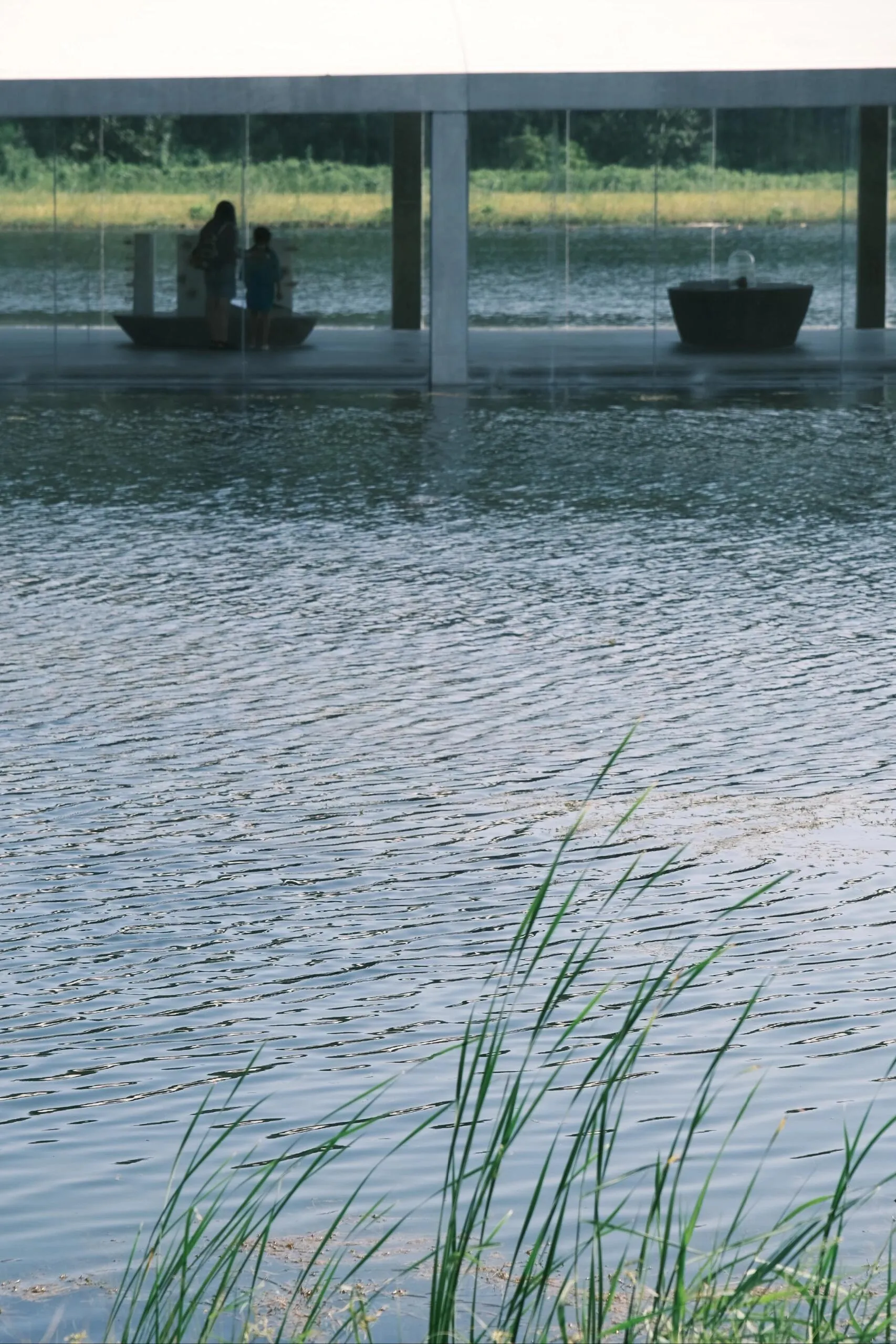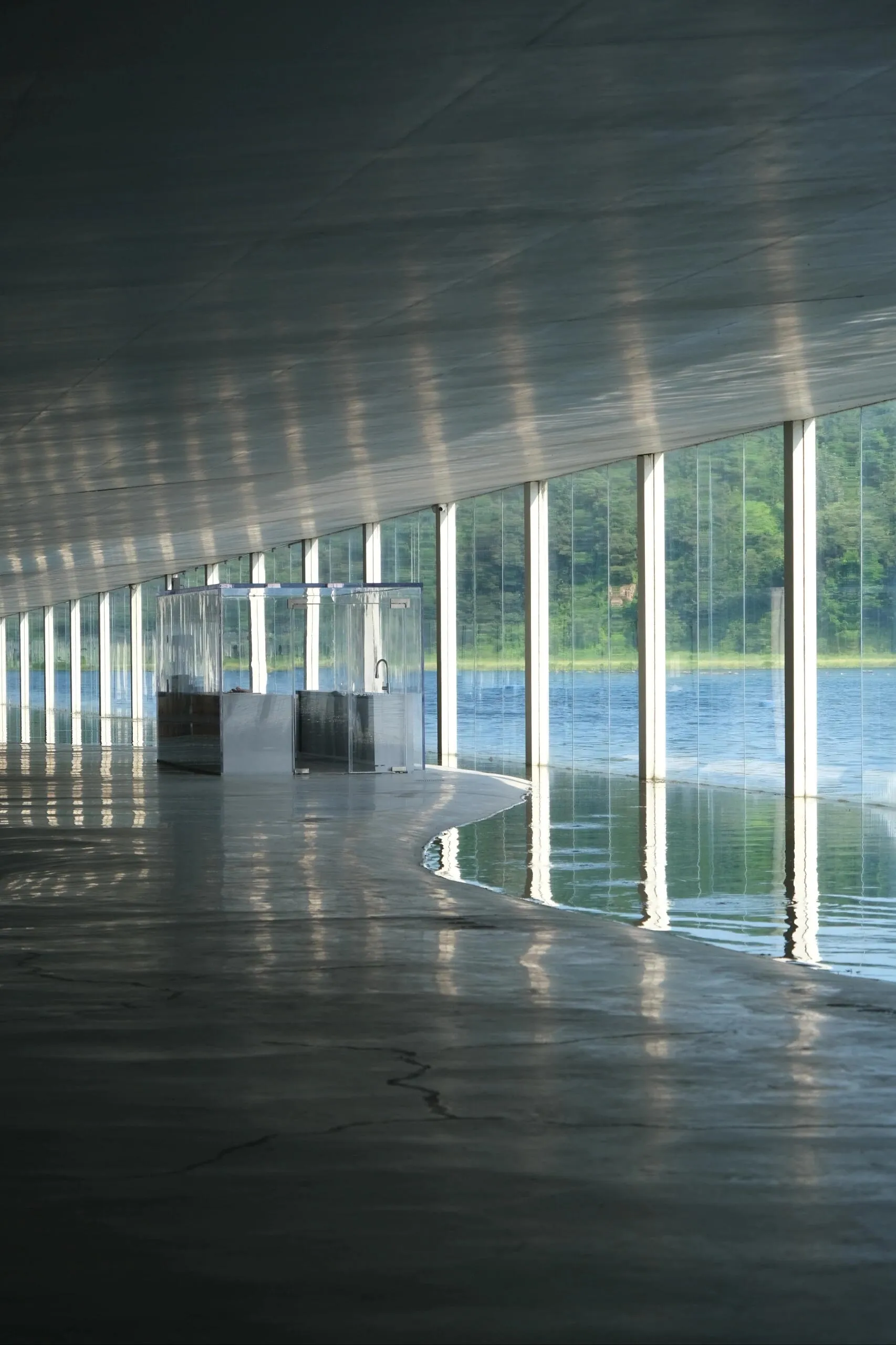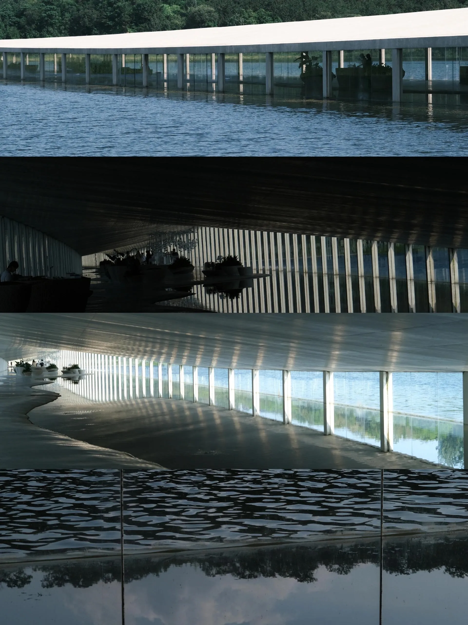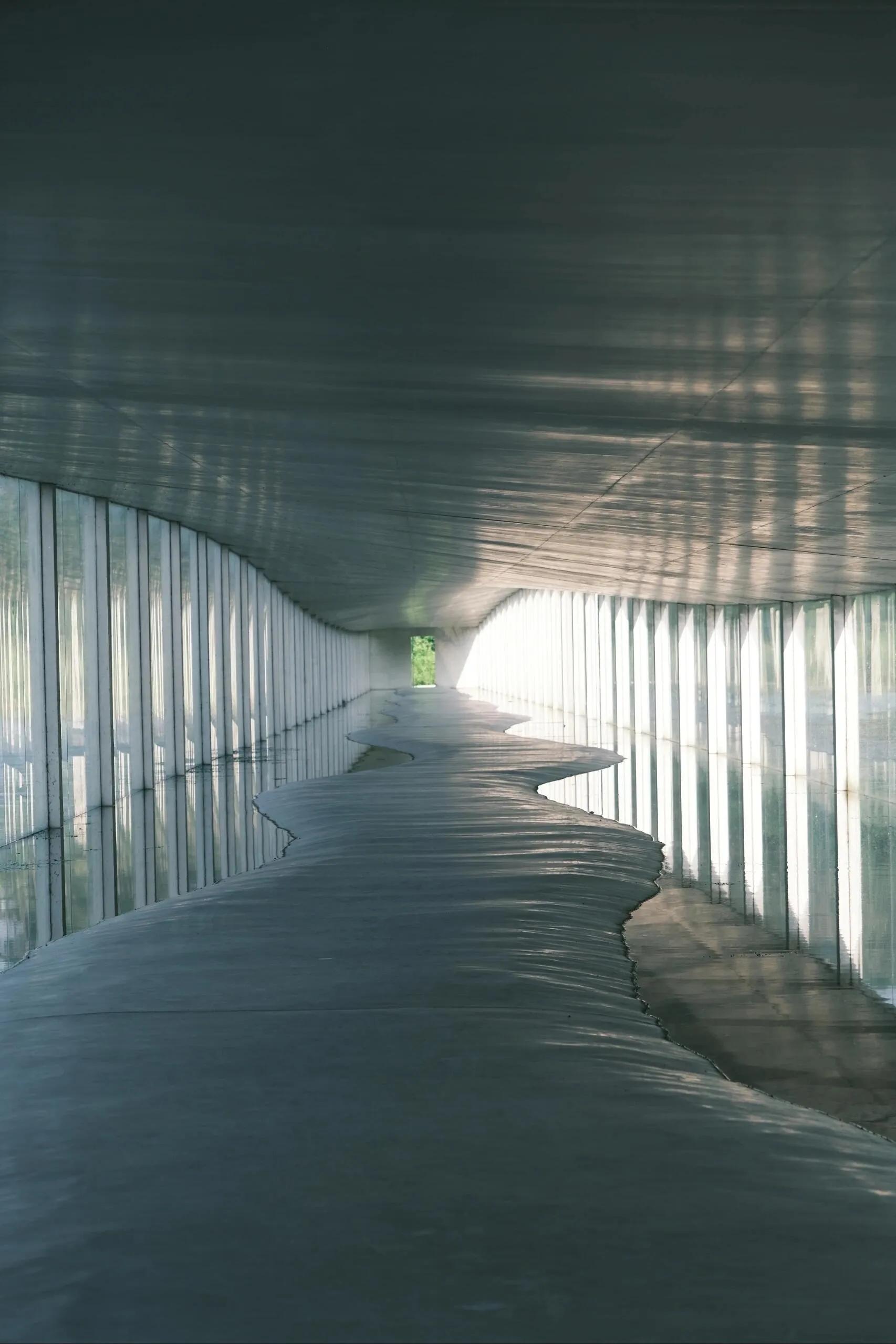 建筑内部也引入了水体,波光粼粼。 玻璃幕墙和隔断映射出不真实的光影,就像这个长长的夏天,明知道要结束了,却久久不愿离去。