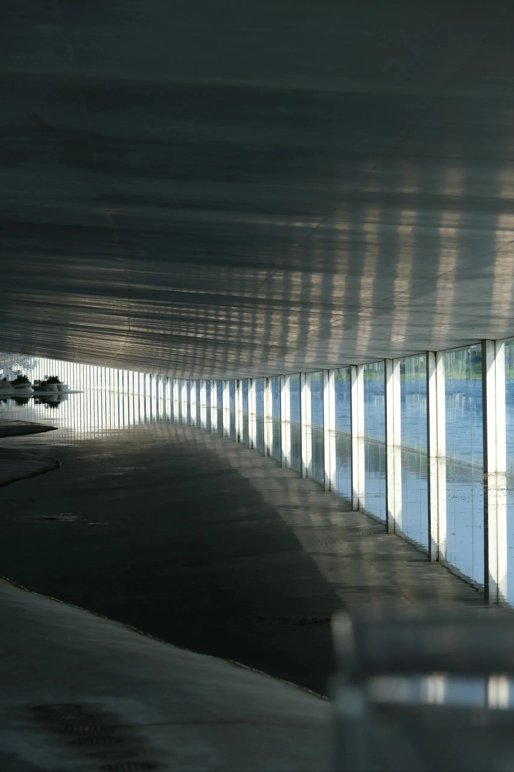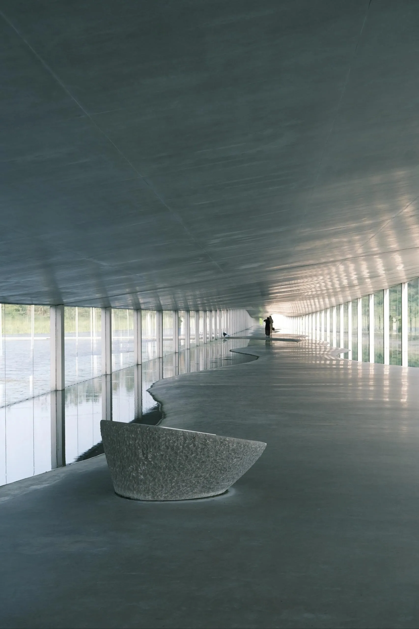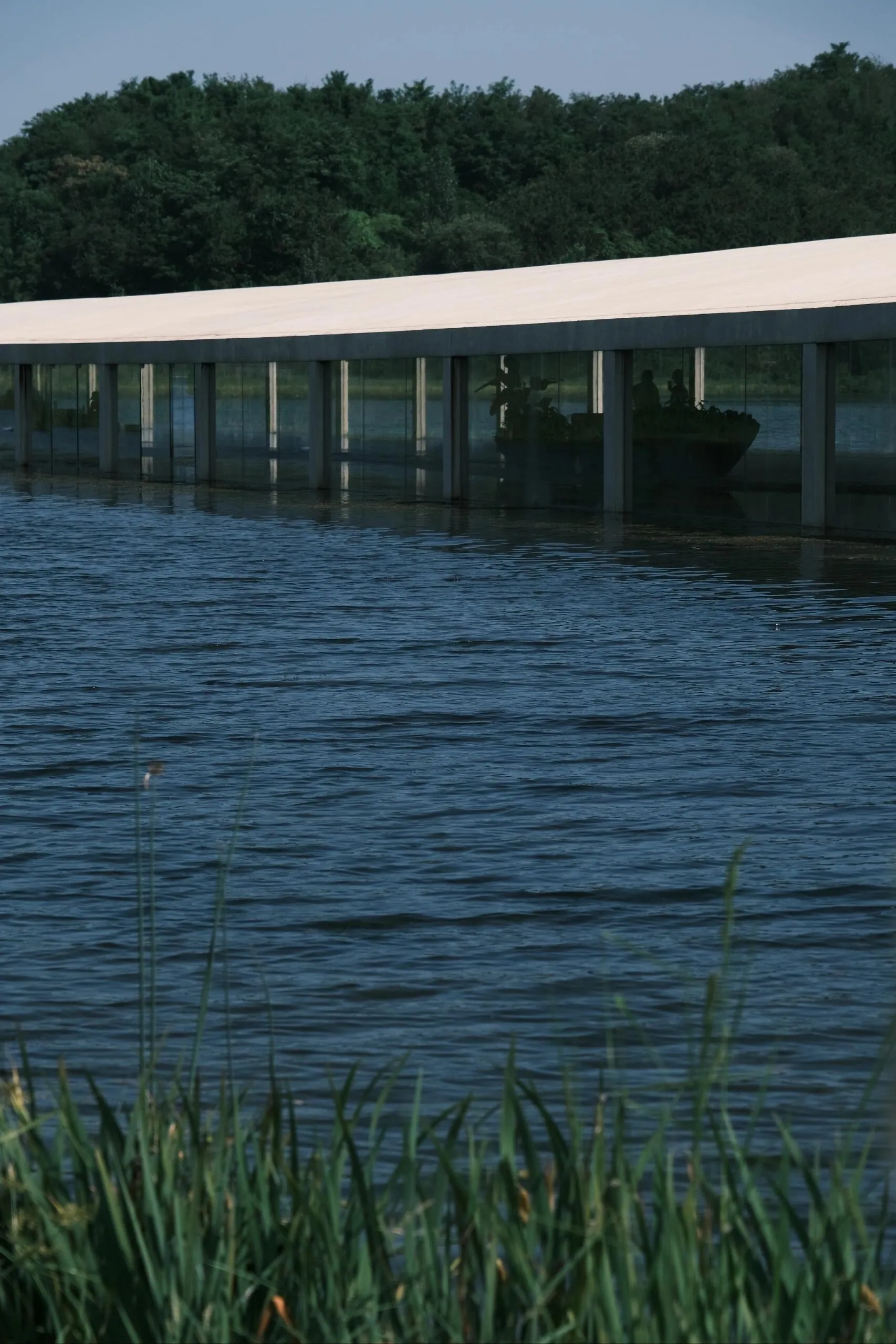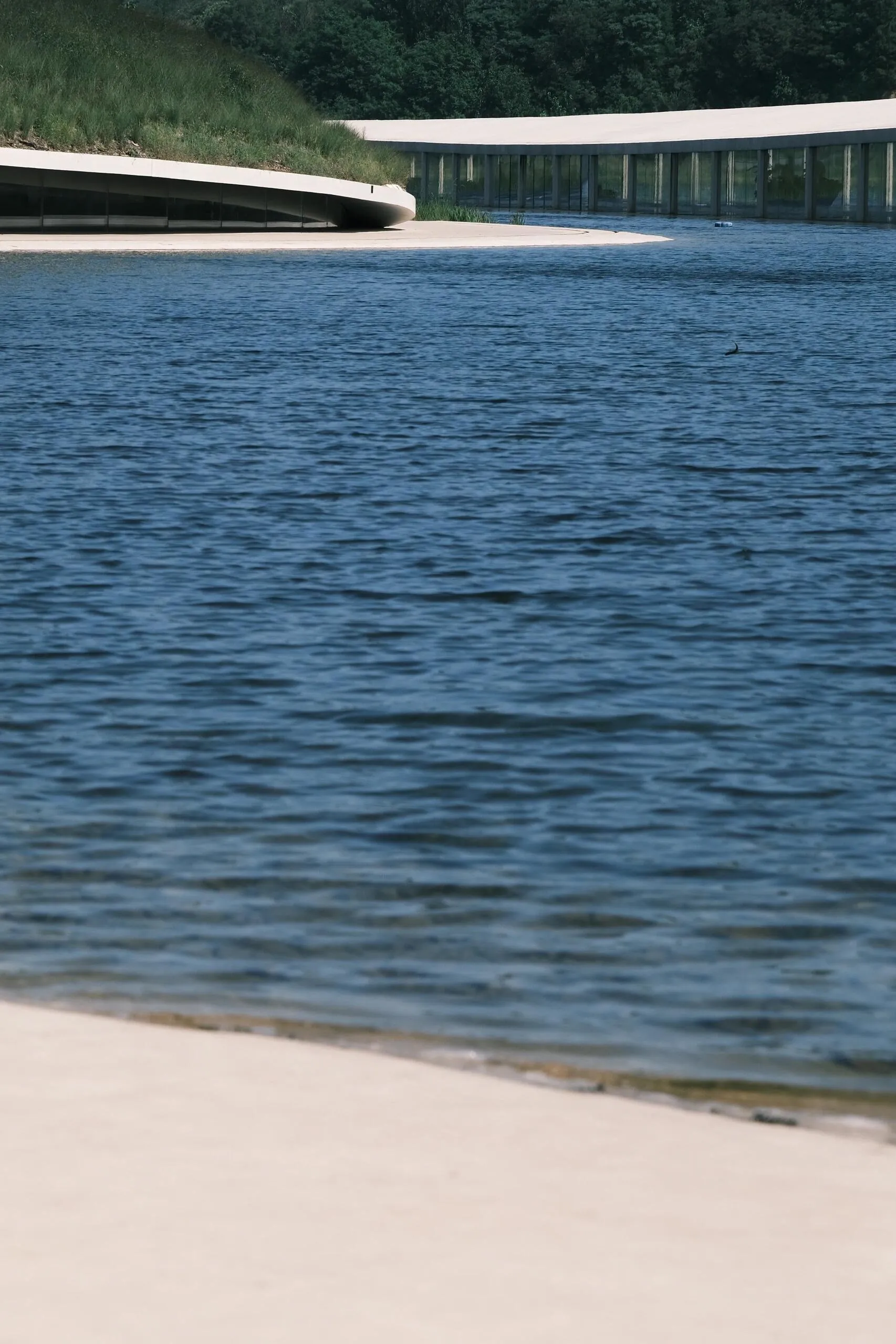 建筑内部也引入了水体,波光粼粼。 玻璃幕墙和隔断映射出不真实的光影,就像这个长长的夏天,明知道要结束了,却久久不愿离去。