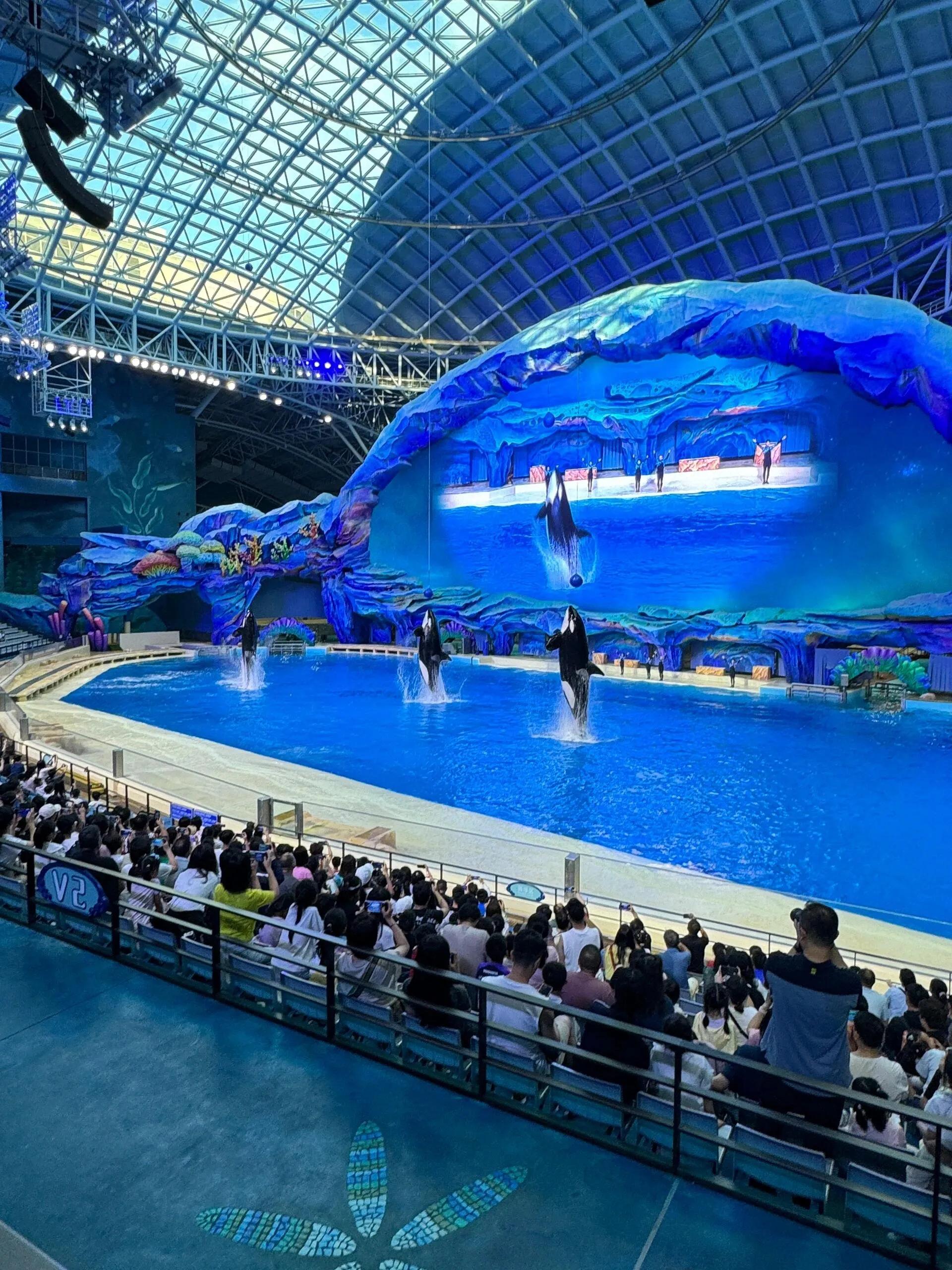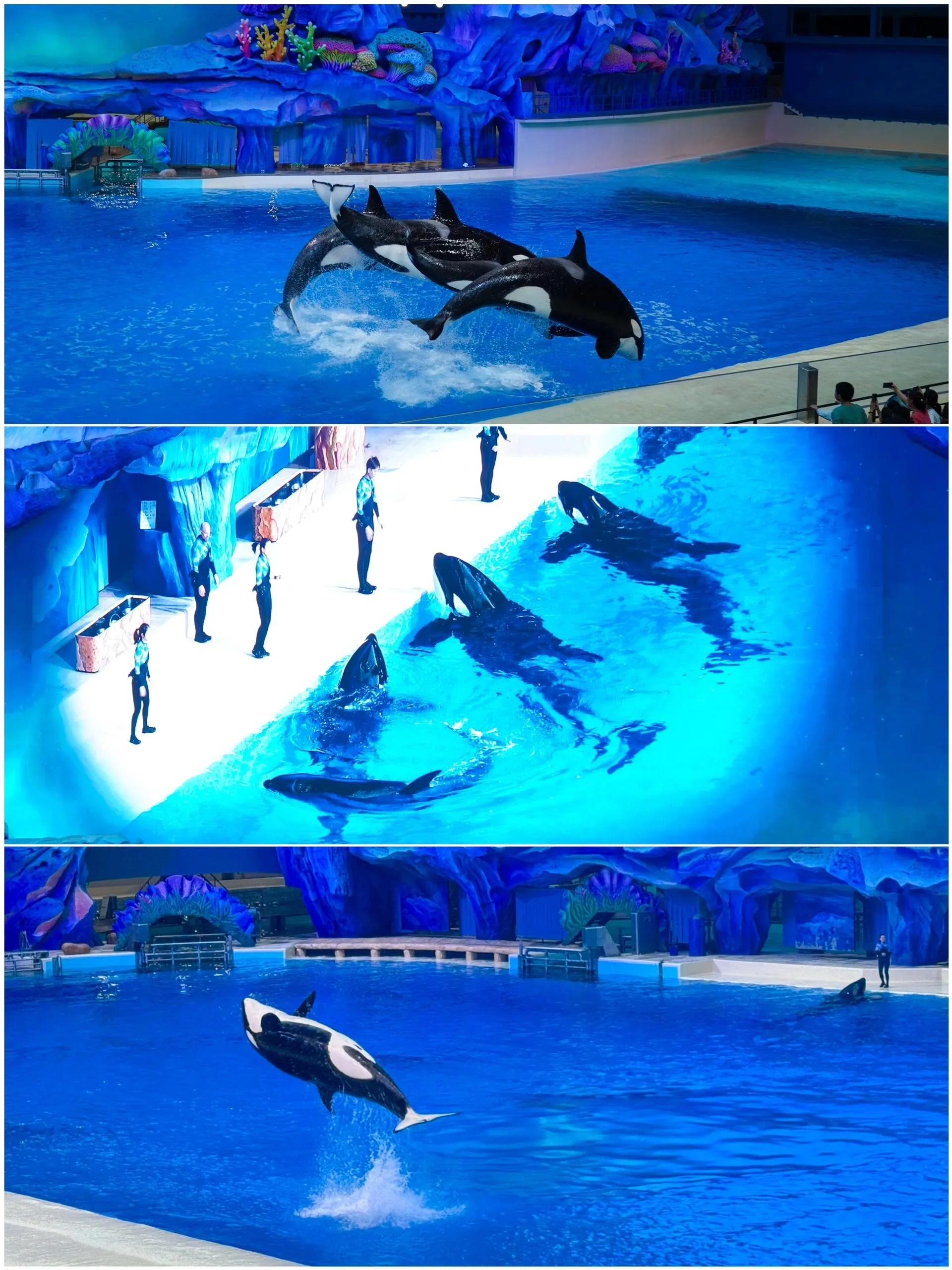 一楼的鲸奇宇宙也是必打卡的景点。我们在这里近距离接触了聪明的虎鲸,还拍了张亲密合照。在虎鲸科普剧场,我们被虎鲸拍水嬉戏、跳跃和快速游动的表演深深震撼。