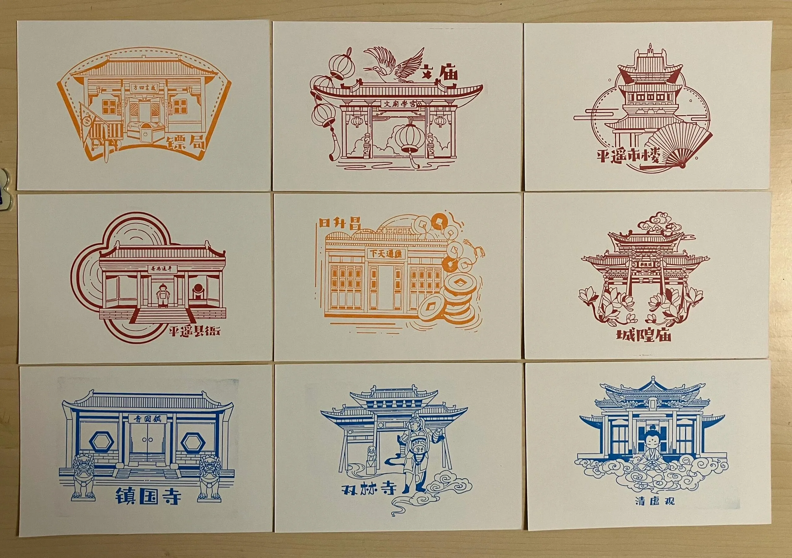 此外,文庙门口的云路老街入口处有一家嗷呜文创,提供很多单色章。值得注意的是,平遥古城内盖章点众多,可能难以一一尝试。