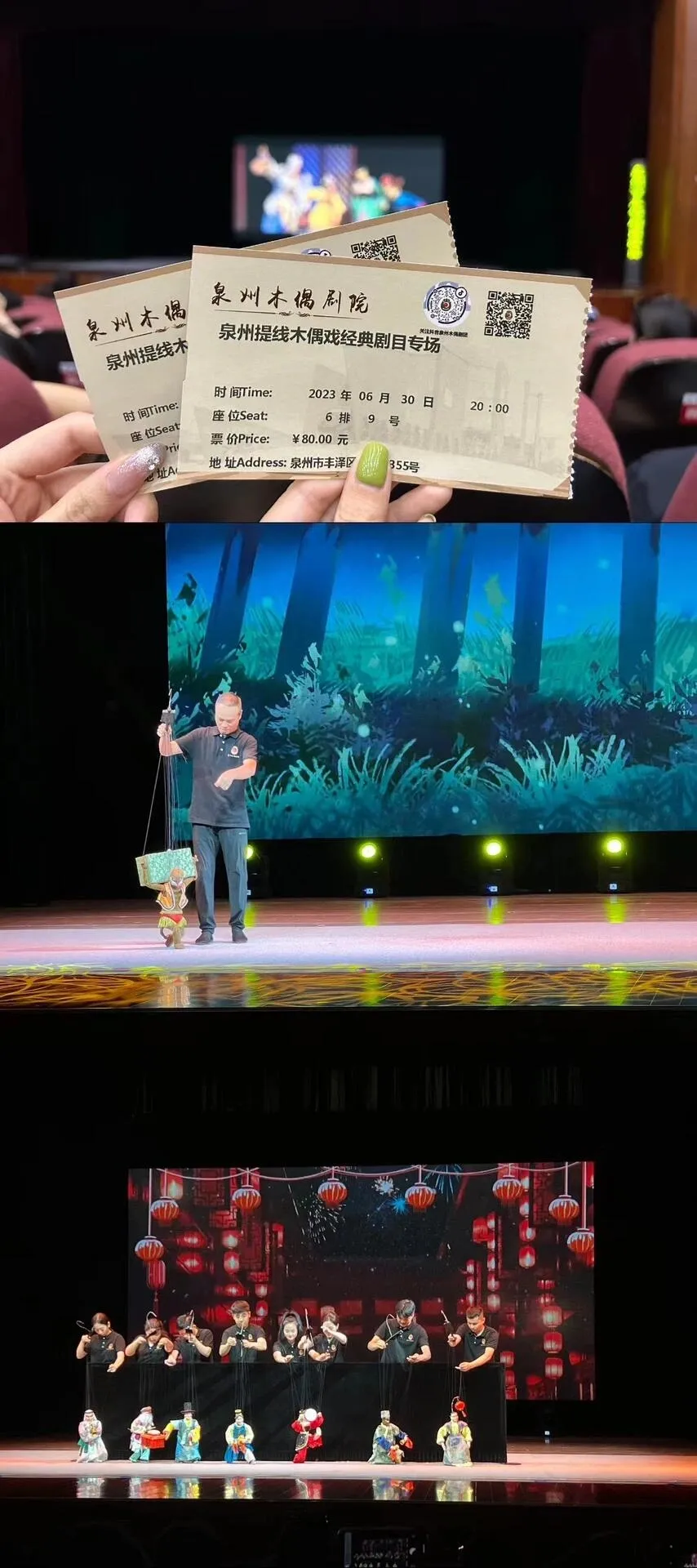 早上8:20乘船返回文甲码头,然后坐车到莆田站,10:06乘高铁抵达泉州站。入住泉州西湖酒店,装修还行,但服务和早餐一般。我们本想去梧林传统村落拍摄娘惹写真,可惜没能成功。晚上在泉州木偶剧院观看了木偶戏表演,建议提前在公众号上订票,尤其是前排座位。