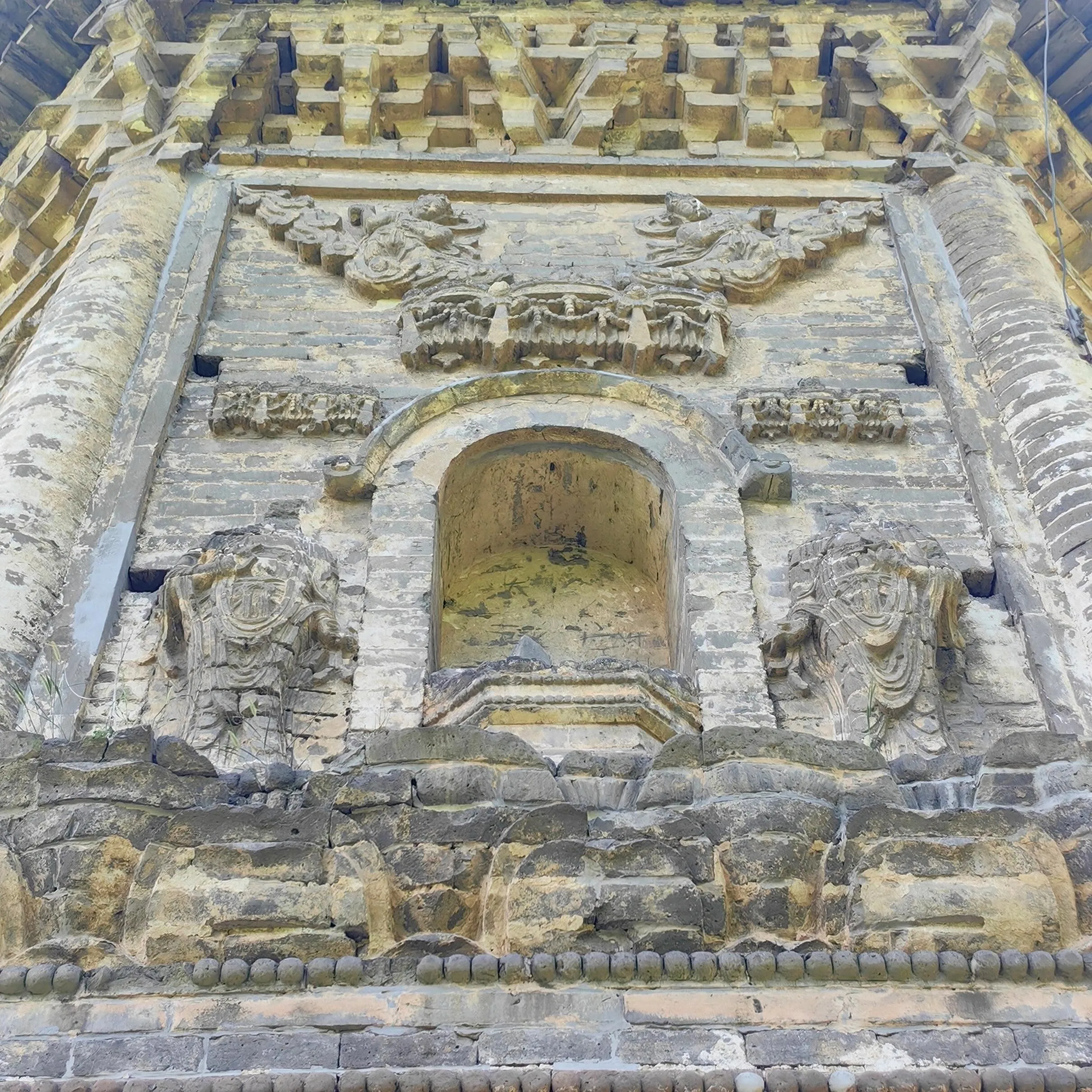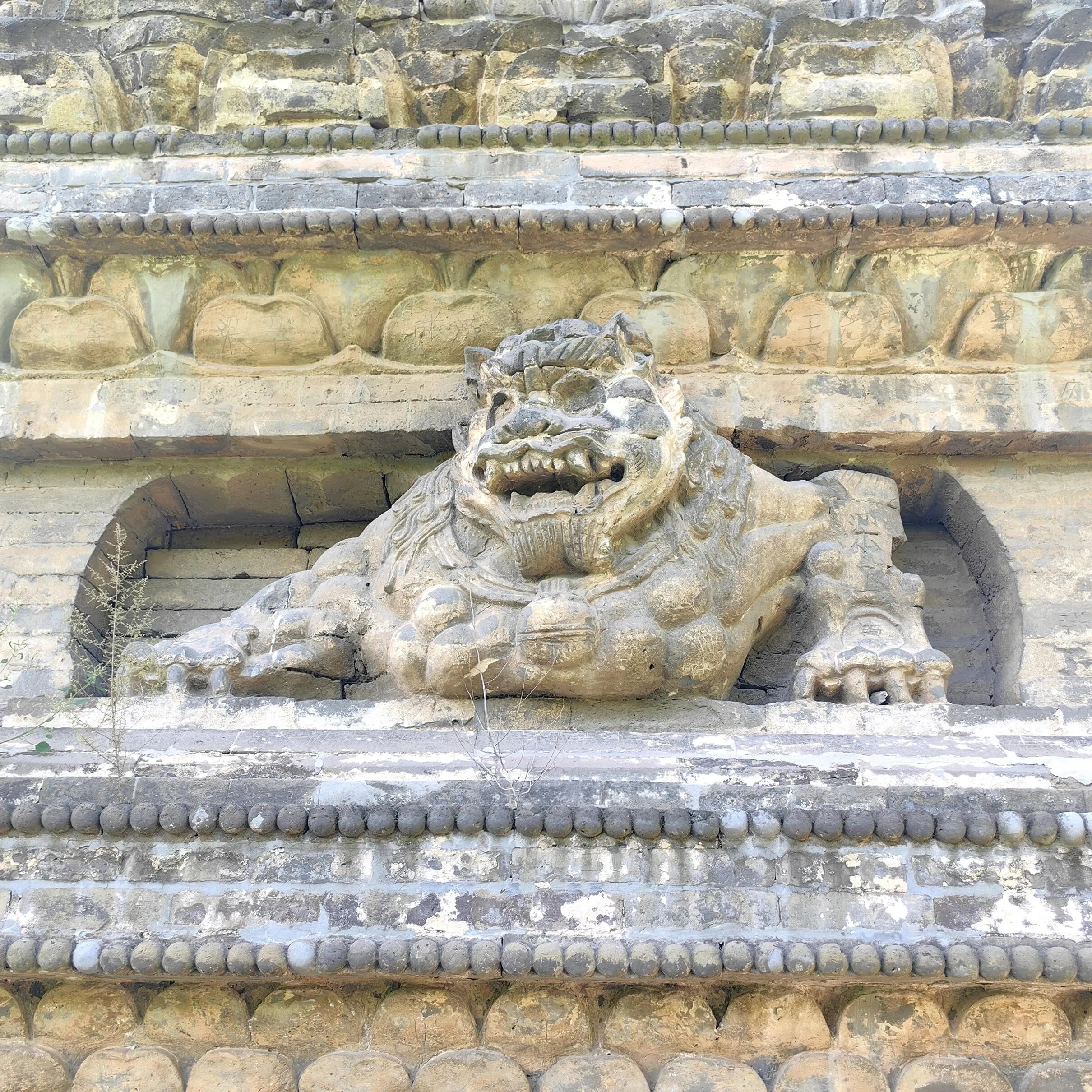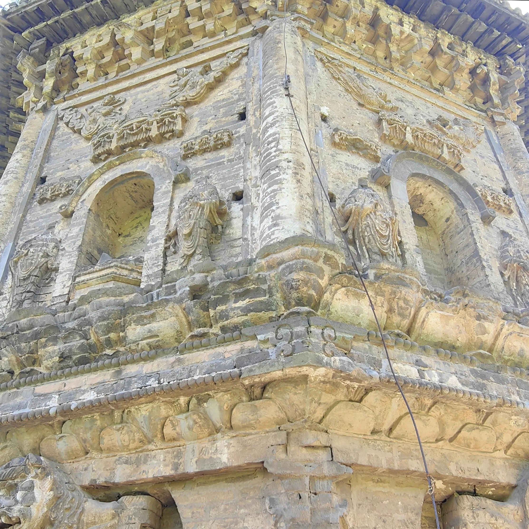 金塔的砖雕不仅精美,而且布局合理。 乐舞人物砖雕栩栩如生 ,或抚琴、或吹箫,形象生动,造型优美。半身伏狮砖雕形态逼真,气势威武,在现存辽塔中保存较为完好。塔的八个角均有砖砌圆柱,每面有一拱龛,龛内原本雕有坐佛一尊,可惜如今已不复存在。两旁立有胁侍,披戴璎珞,脚踏莲花。龛门上方雕有四垂大宝盖,盖上的飞天形体秀美。