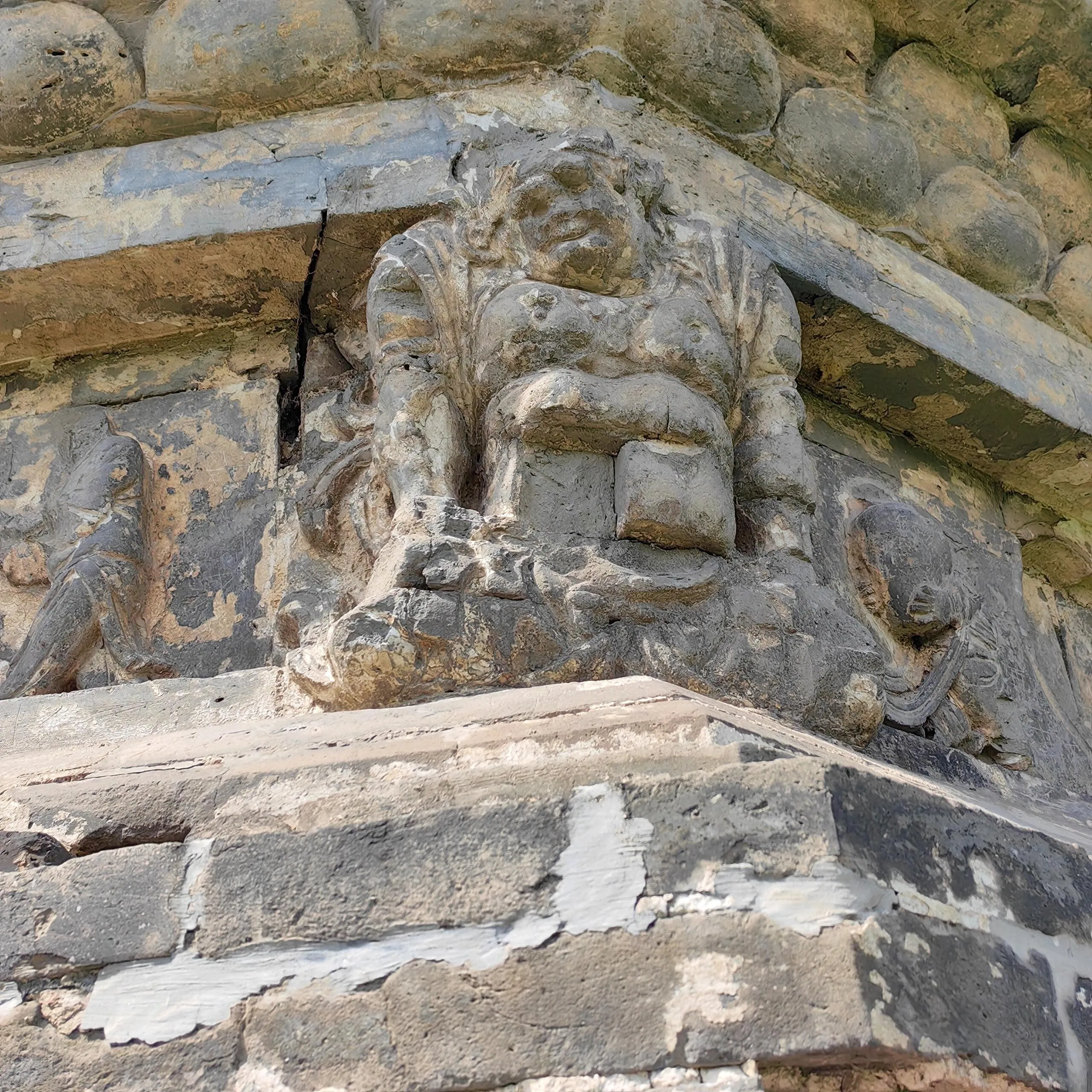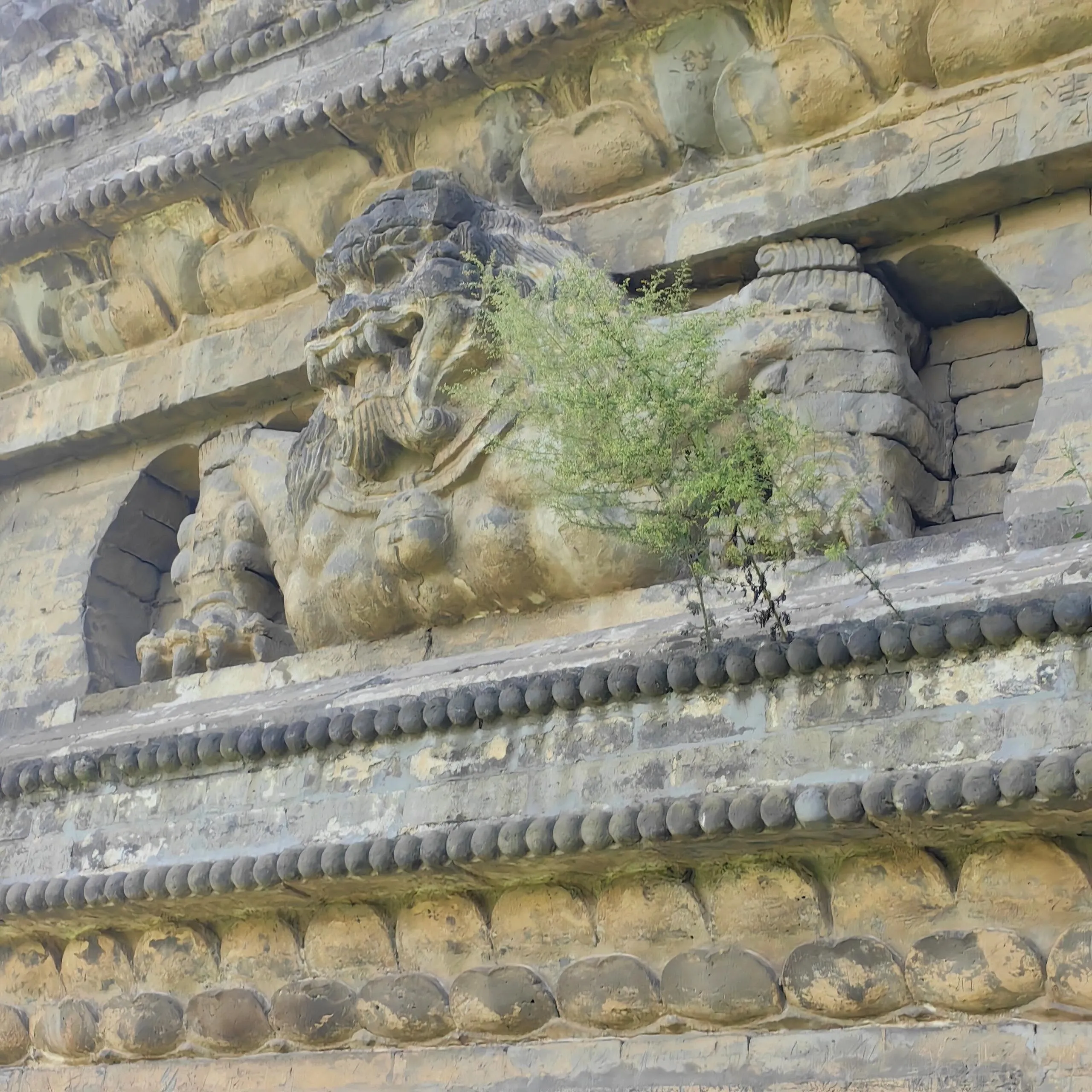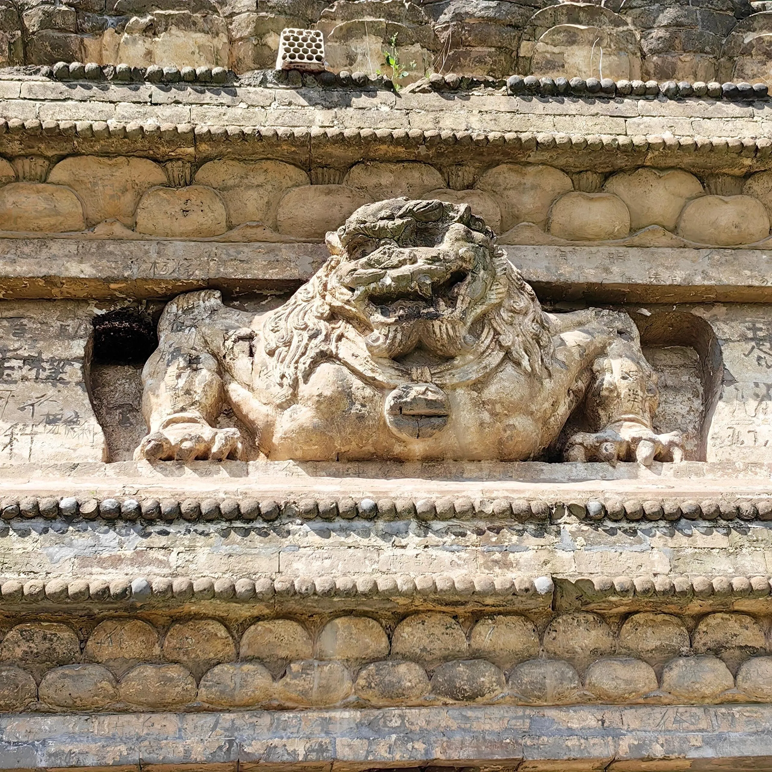 金塔的砖雕不仅精美,而且布局合理。 乐舞人物砖雕栩栩如生 ,或抚琴、或吹箫,形象生动,造型优美。半身伏狮砖雕形态逼真,气势威武,在现存辽塔中保存较为完好。塔的八个角均有砖砌圆柱,每面有一拱龛,龛内原本雕有坐佛一尊,可惜如今已不复存在。两旁立有胁侍,披戴璎珞,脚踏莲花。龛门上方雕有四垂大宝盖,盖上的飞天形体秀美。
