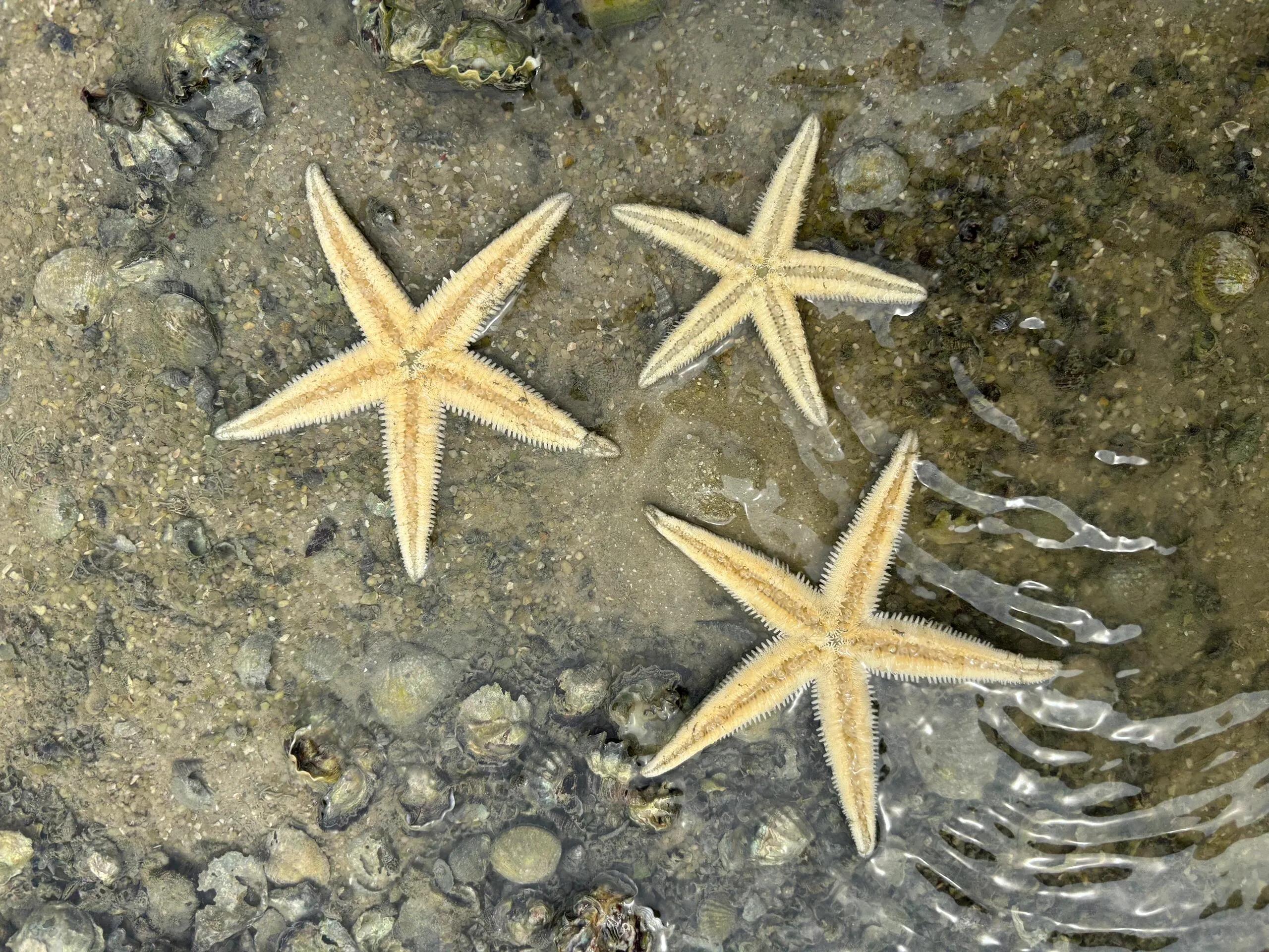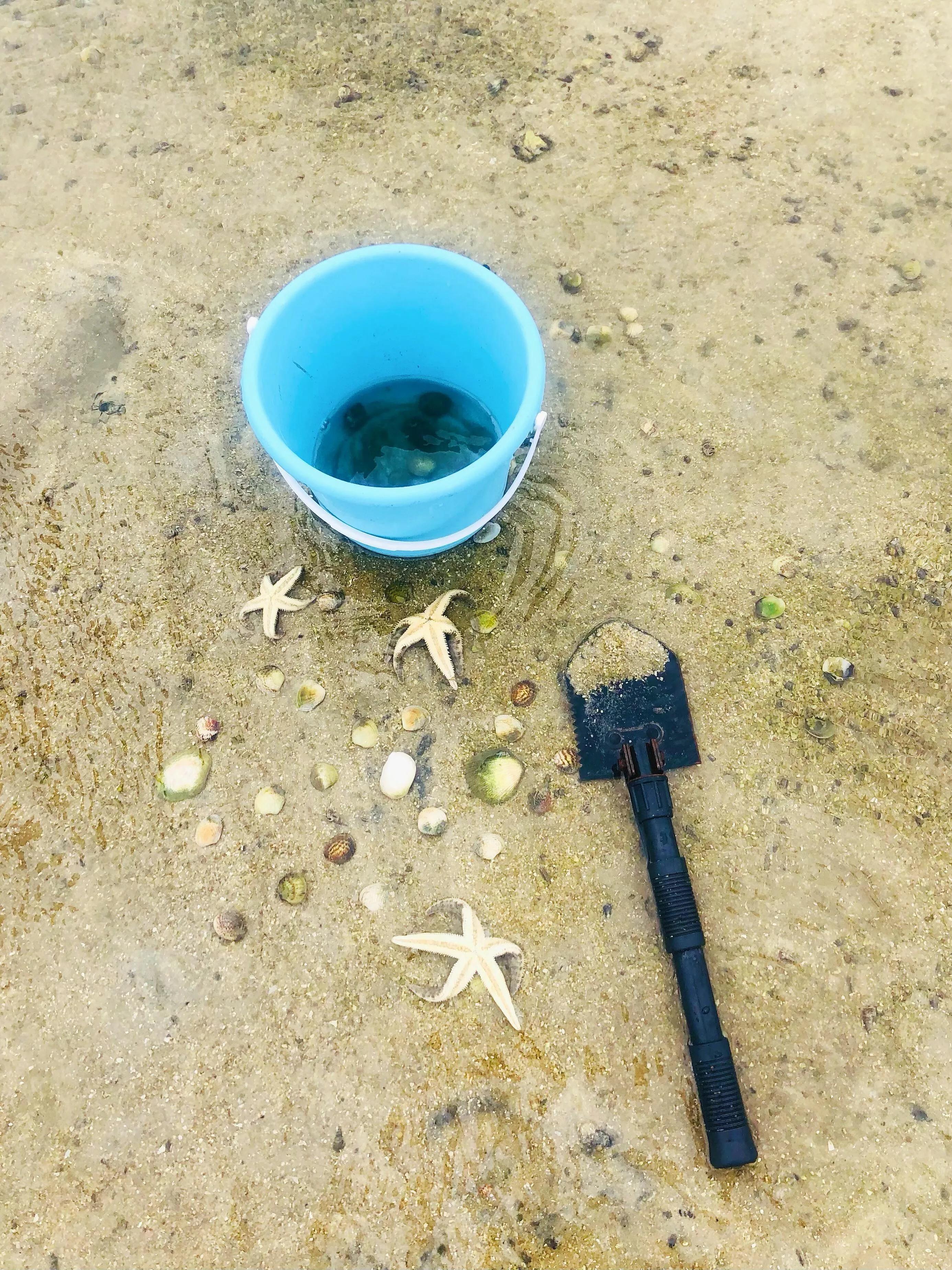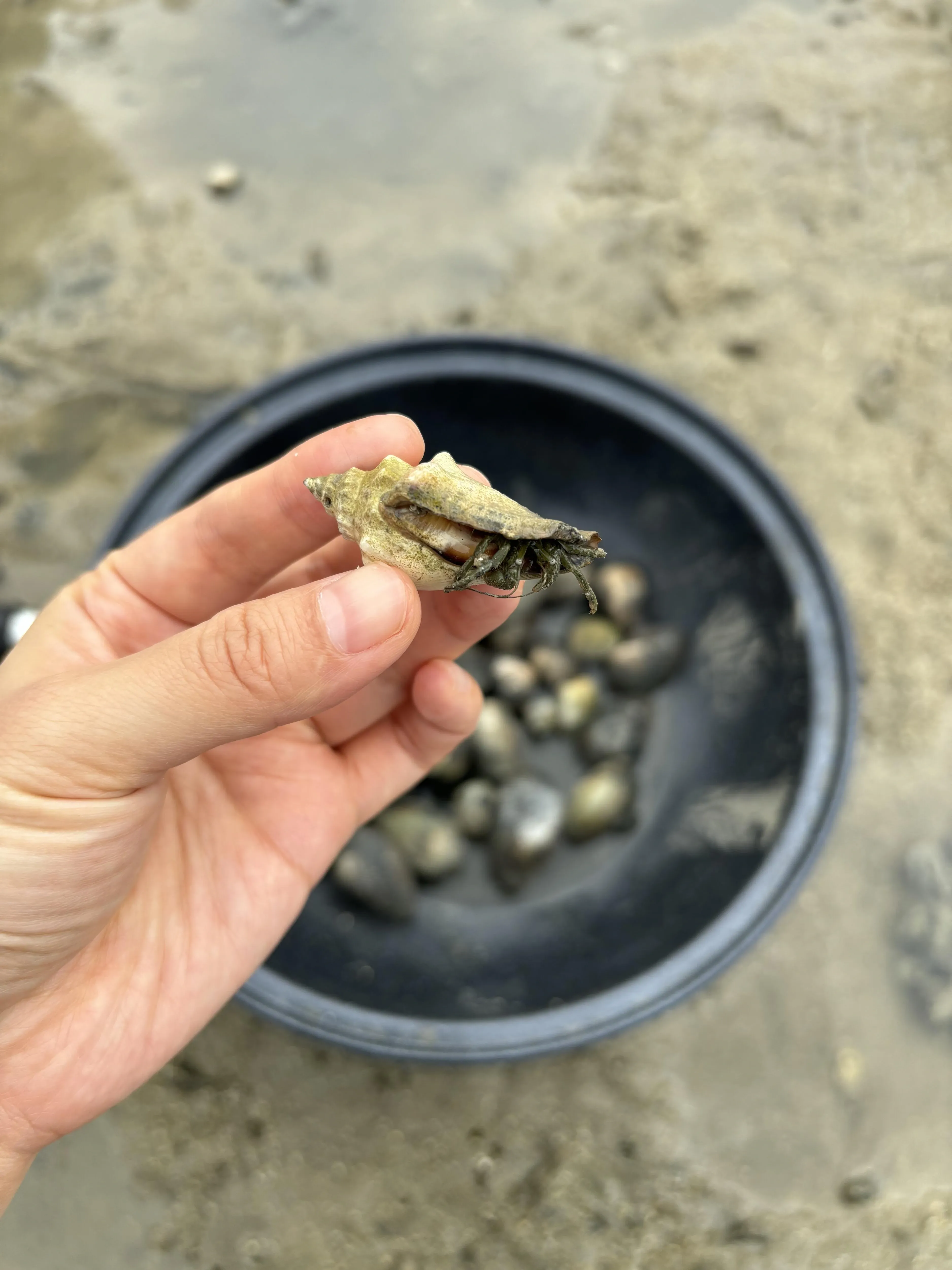 这边贝壳超多,寄居蟹也多,翻石头还有活体的宝螺。海星都不用去海里,就在海边溜达就能看到,海星是深色这面朝上,不好看出来,慢慢走着看,特别多。沙滩上的小圆洞,大概率有沙蟹,拿铲子需要快速挖,要不就跑走了。这片海滩真的是捡到不想捡,根本捡不完!