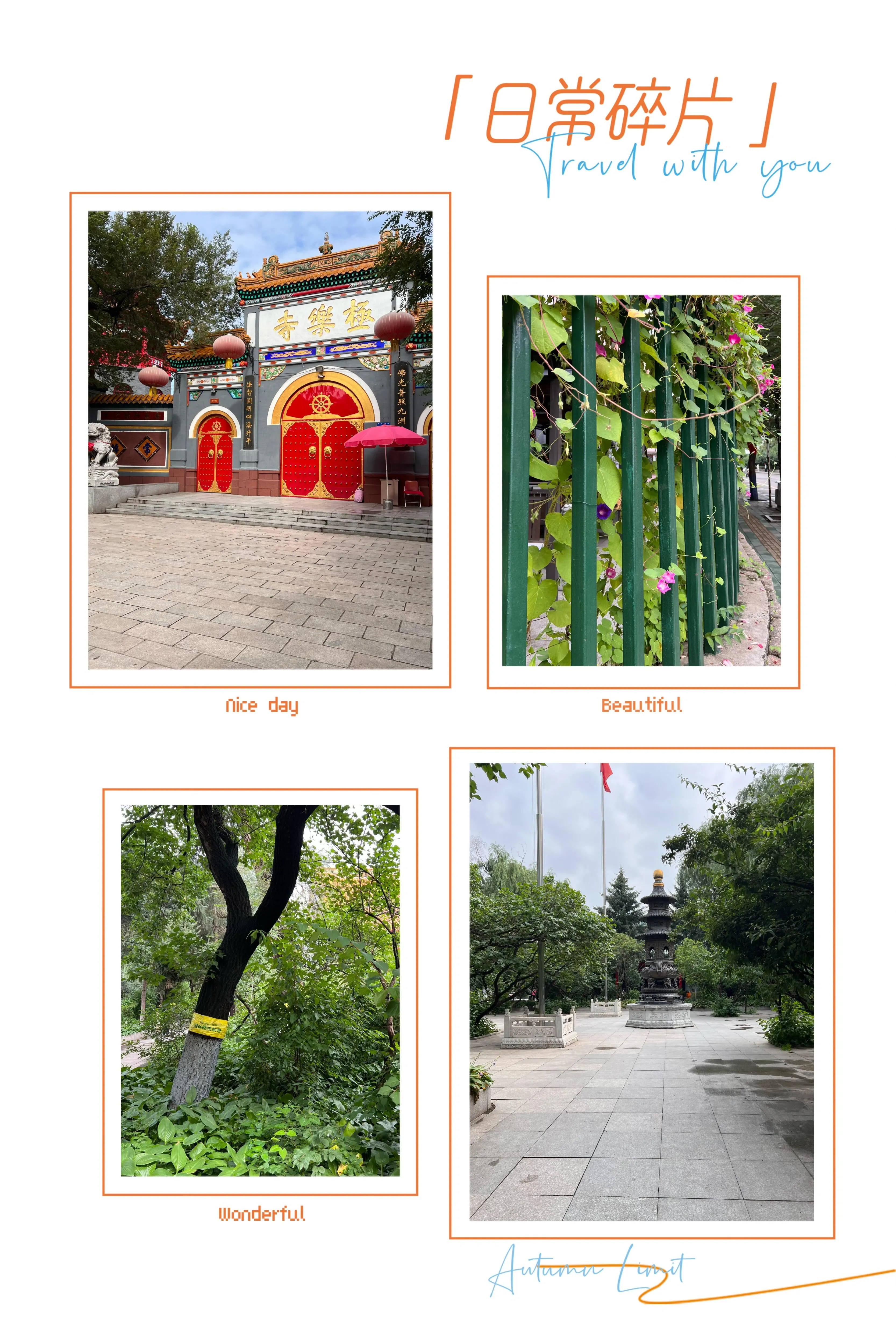 行程第一站是极乐寺。 早上7点出发,乘坐公交车到达后,在寺内逛了1.5小时 。12年前曾来此听过早课,如今故地重游,景色依然美丽。