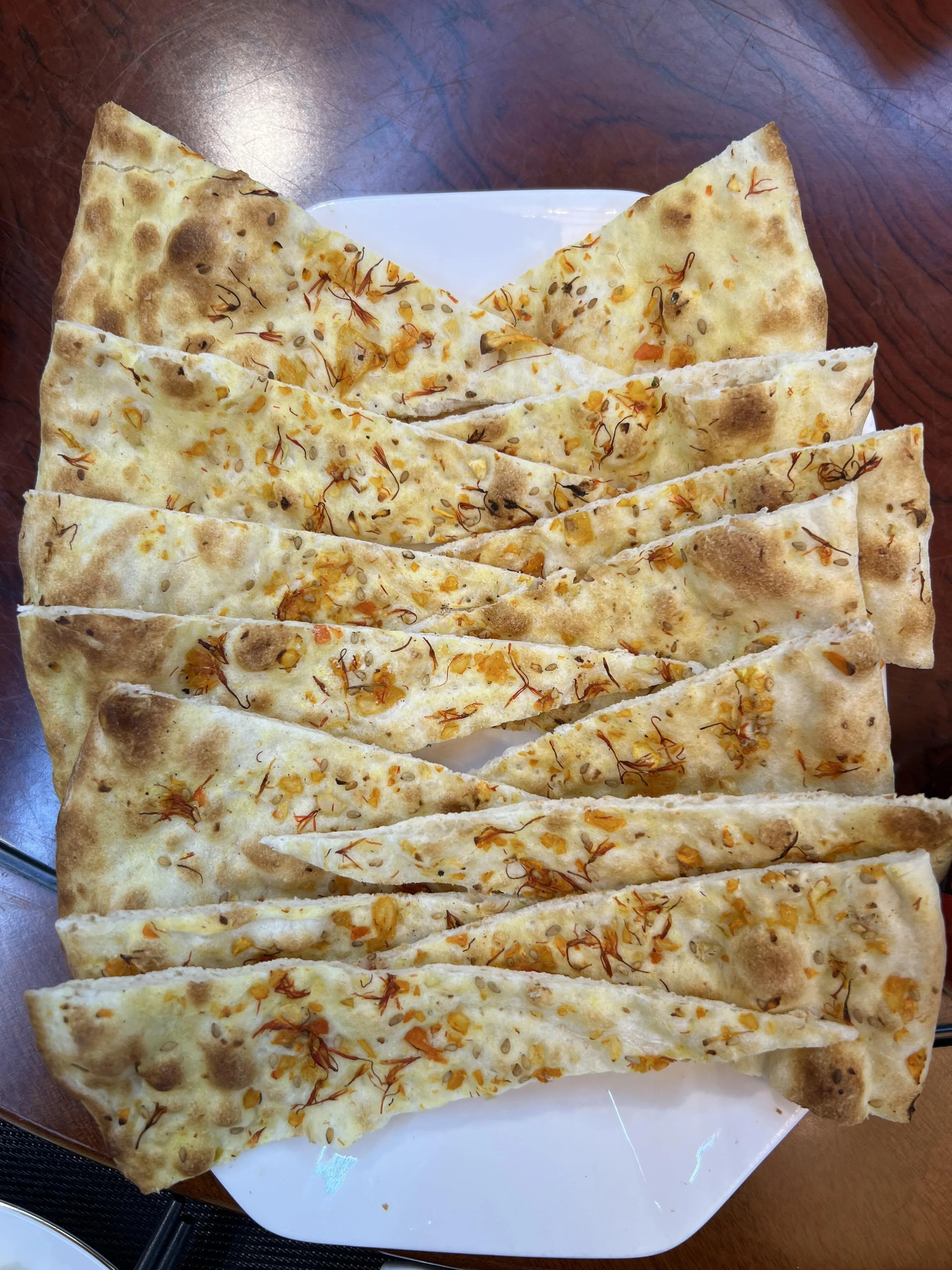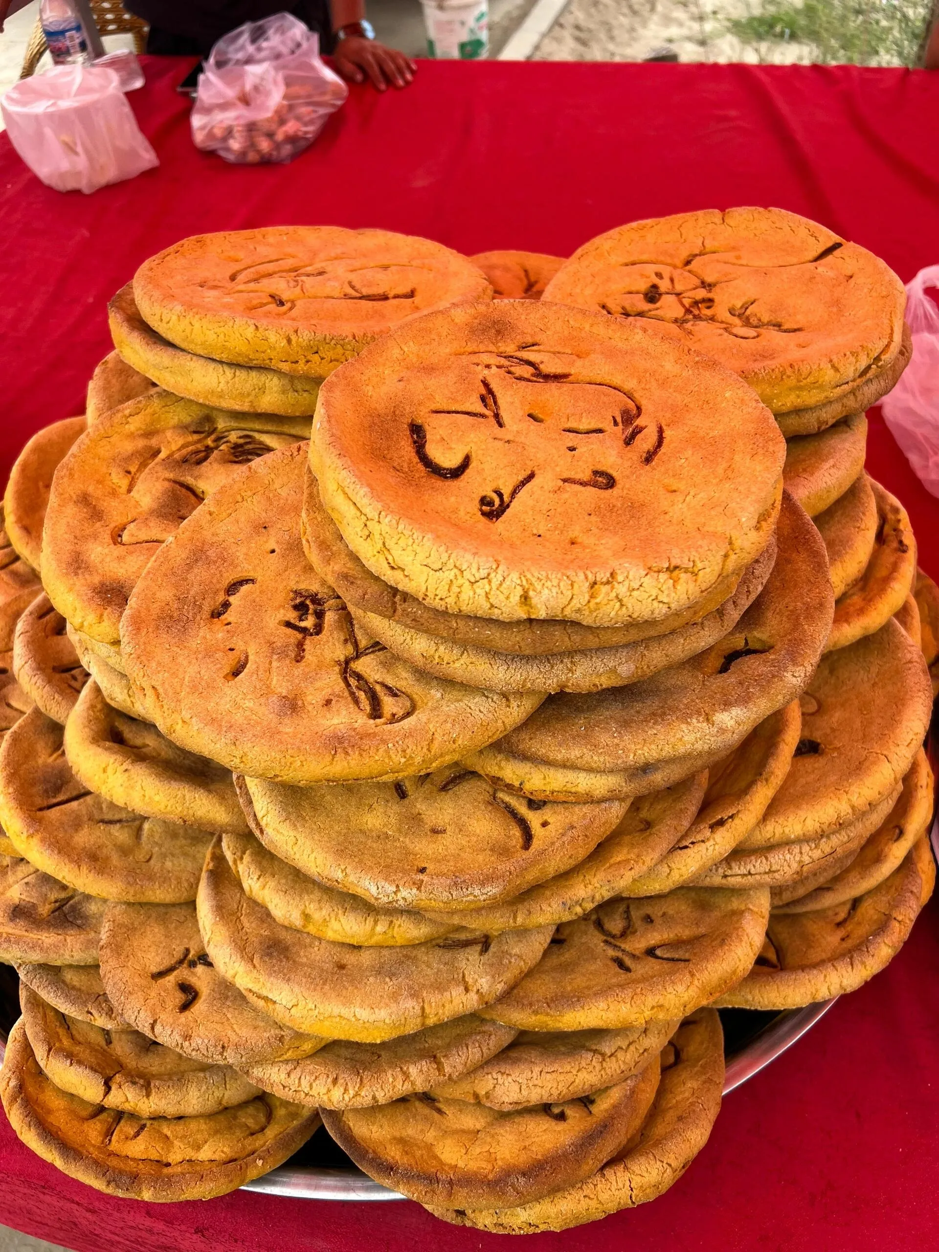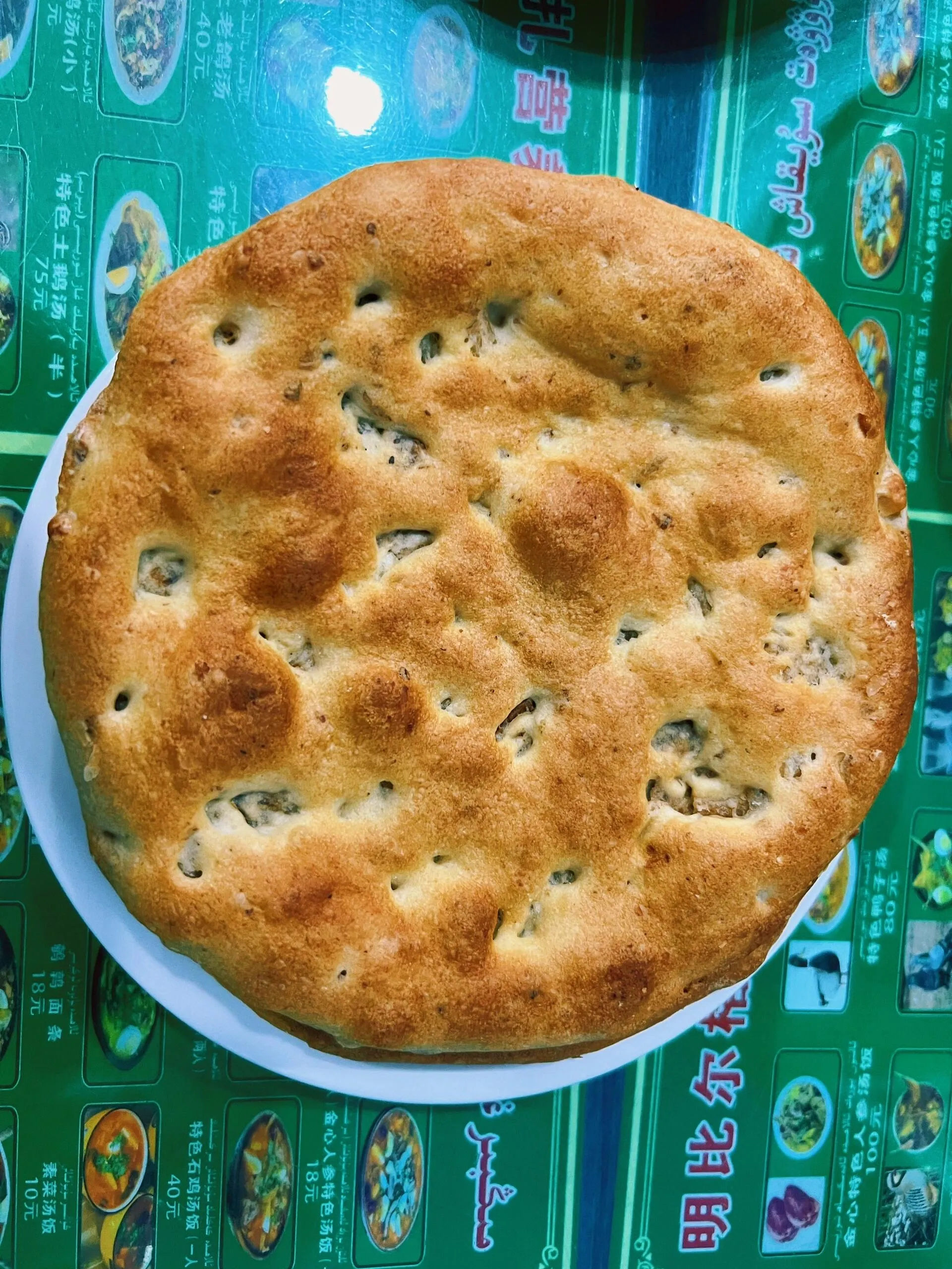 “喀克恰”是一种超大且薄的馕 ,上面点缀着红花、芝麻和洋葱。它不仅可以当主食,还可以切成小片当零食享用。在策勒县,人们喜欢在上面抹些油辣子食用,别有风味。