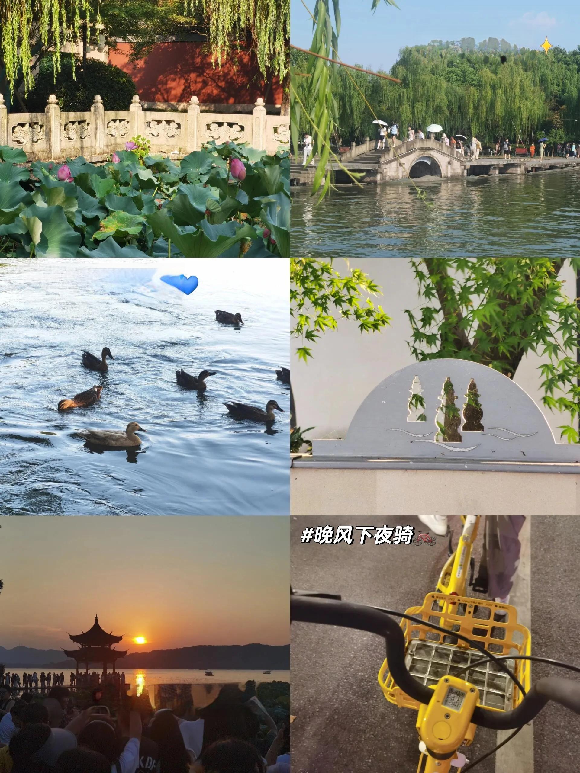 下午三点左右前往杭州西湖 ,游览西湖景色并体验游船。傍晚六点左右可以欣赏到美丽的日落,推荐在集贤亭附近拍摄。 晚上骑行返回酒店 ,值得一提的是杭州有专门的自行车红绿灯,非常新奇。