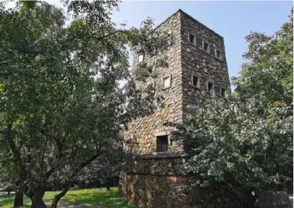 如上图,北京植物园中矗立着几座外形像炮楼的建筑,显得十分突出。
