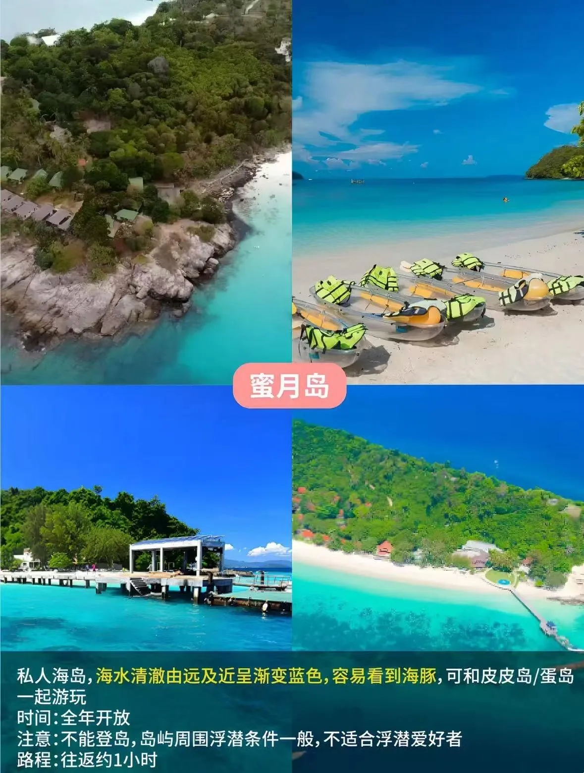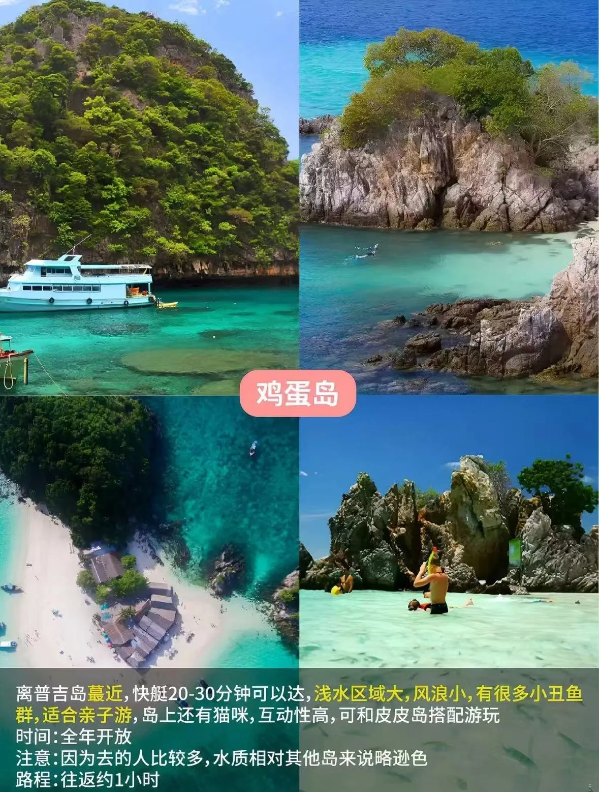 离普吉岛最近,快艇20-30分钟可到达。浅水区域大,风浪小,有很多小丑鱼群,适合亲子游。岛上还有猫咪,互动性高。可与皮皮岛搭配游玩。全年开放,但因游客较多,水质相对其他岛略逊色。往返时间约1小时。