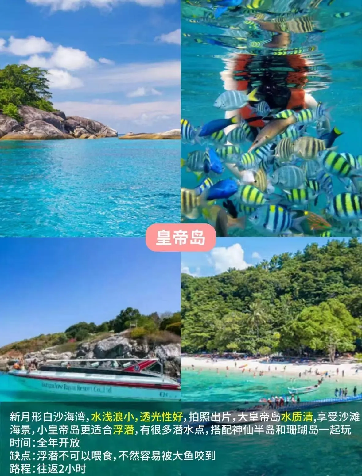 以新月形白沙海湾著称,水浅浪小,透光性好,适合拍照。大皇帝岛水质清澈,适合享受沙滩海景;小皇帝岛更适合浮潜,有很多潜水点。通常与神仙半岛和珊瑚岛一起游玩。全年开放,但浮潜时