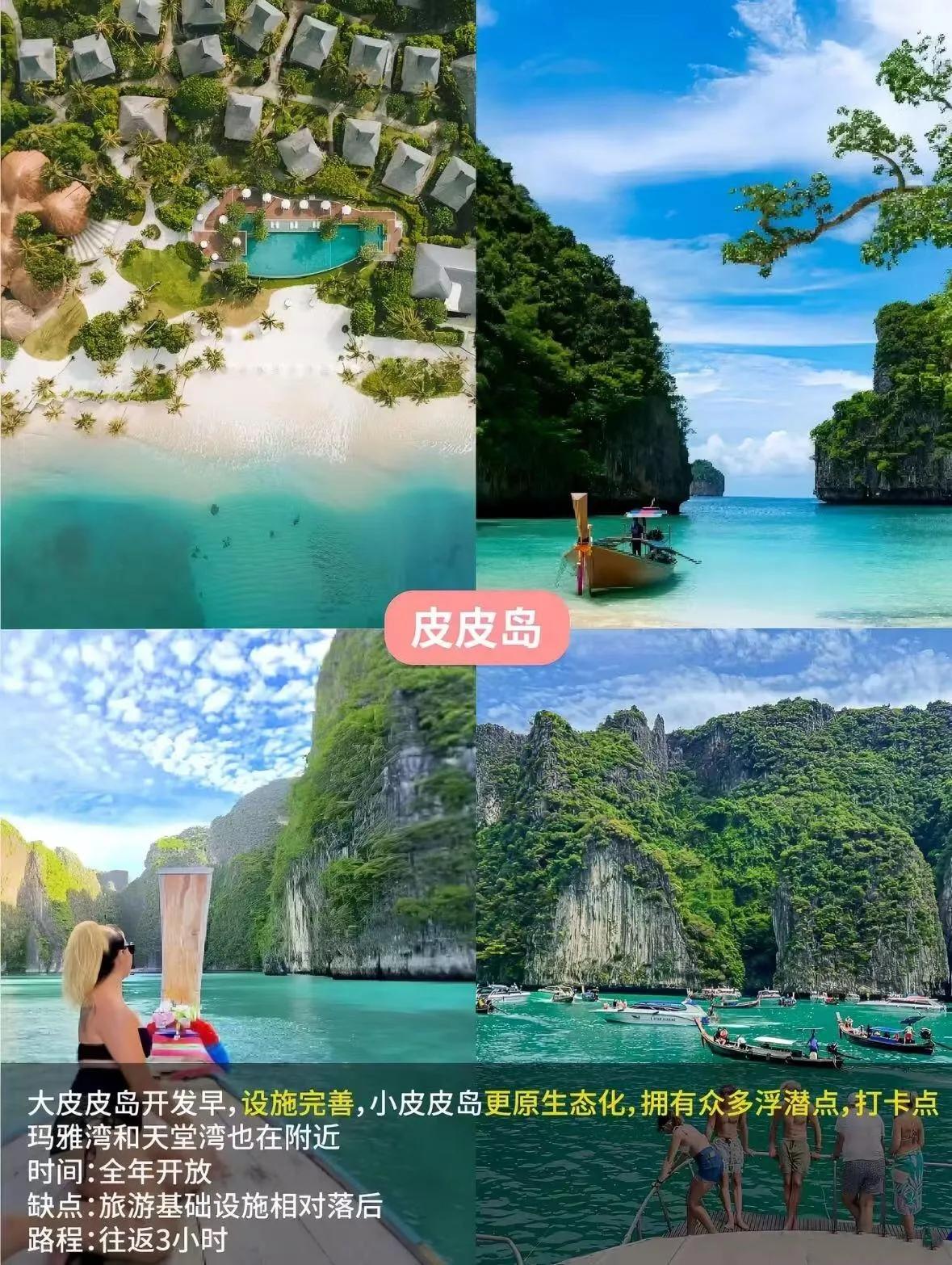 大皮皮岛开发较早,设施完善;小皮皮岛更原生态,拥有众多浮潜点。著名的玛雅湾和天堂湾也在附近。全年开放,但旅游基础设施相对落后。往返时间约3小时。