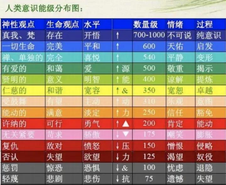 著名心理学家大卫·霍金斯在其书《意念力》中,将人的意识划分为17个能量层级。