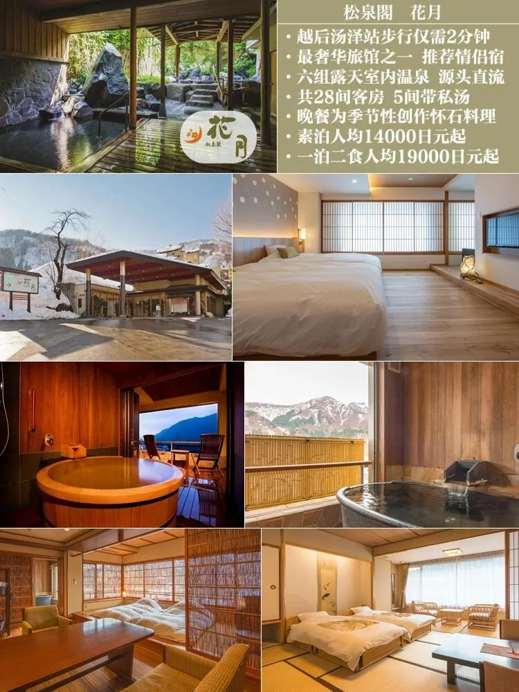 松泉閣花月:这家酒店距离JR站极近,是越后汤泽最高级的住宿之一,在乐天上的服务评分也是最高的。只有28间客房,装修精致。温泉是自家源头的庭园温泉,有4个露天池和2个室内池。特别的是,这里的温泉水可以饮用,泡完汤后可以在休息室喝到。