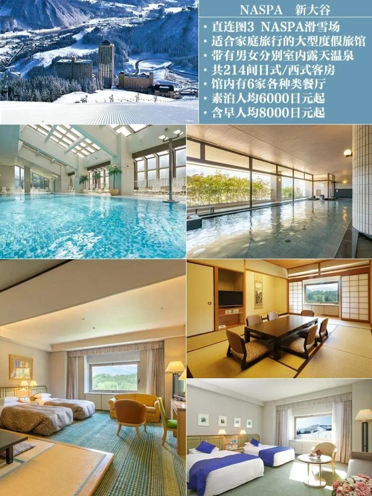 NASPA 新大谷:这家酒店适合家族旅行 ,最大的房间可以住到9人,是日式家庭房。酒店直连NASPA滑雪场,而且酒店内餐厅很多,就算不订含晚餐的客房,也不用担心吃饭问题。