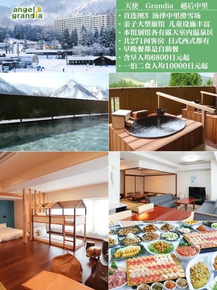 Angel Grandia:这是一家直连中里滑雪场的大型亲子旅馆。 孩童设施丰富,滑雪场和酒店内都有大型儿童活动区,非常受家庭游客欢迎。早晚餐都是自助餐形式。
