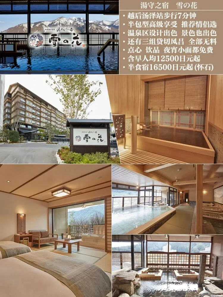 雪の花:这家酒店非常适合情侣选择。 它采用现代日式风格,馆内大量运用木制格调装修,给人温暖且精致的感觉。客房布置舒适,温泉区的泡池极其丰富,还有3组可以包场的温泉,都是免费使用的。晚餐提供创意四季怀石料理,让人期待。