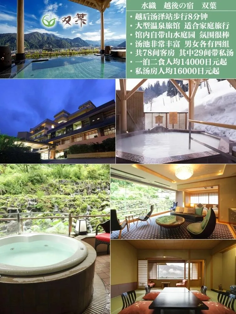 双叶:这里更适合家族旅行。 公共温泉极其丰富,有观景汤、庭园汤、洞窟汤、桧木汤等等。客房样式多样,有西式、日式、和洋式等10多种风格,可住2-6人不等。还有29间带私人温泉的客房,性价比很高。晚餐是传统的怀石料理。