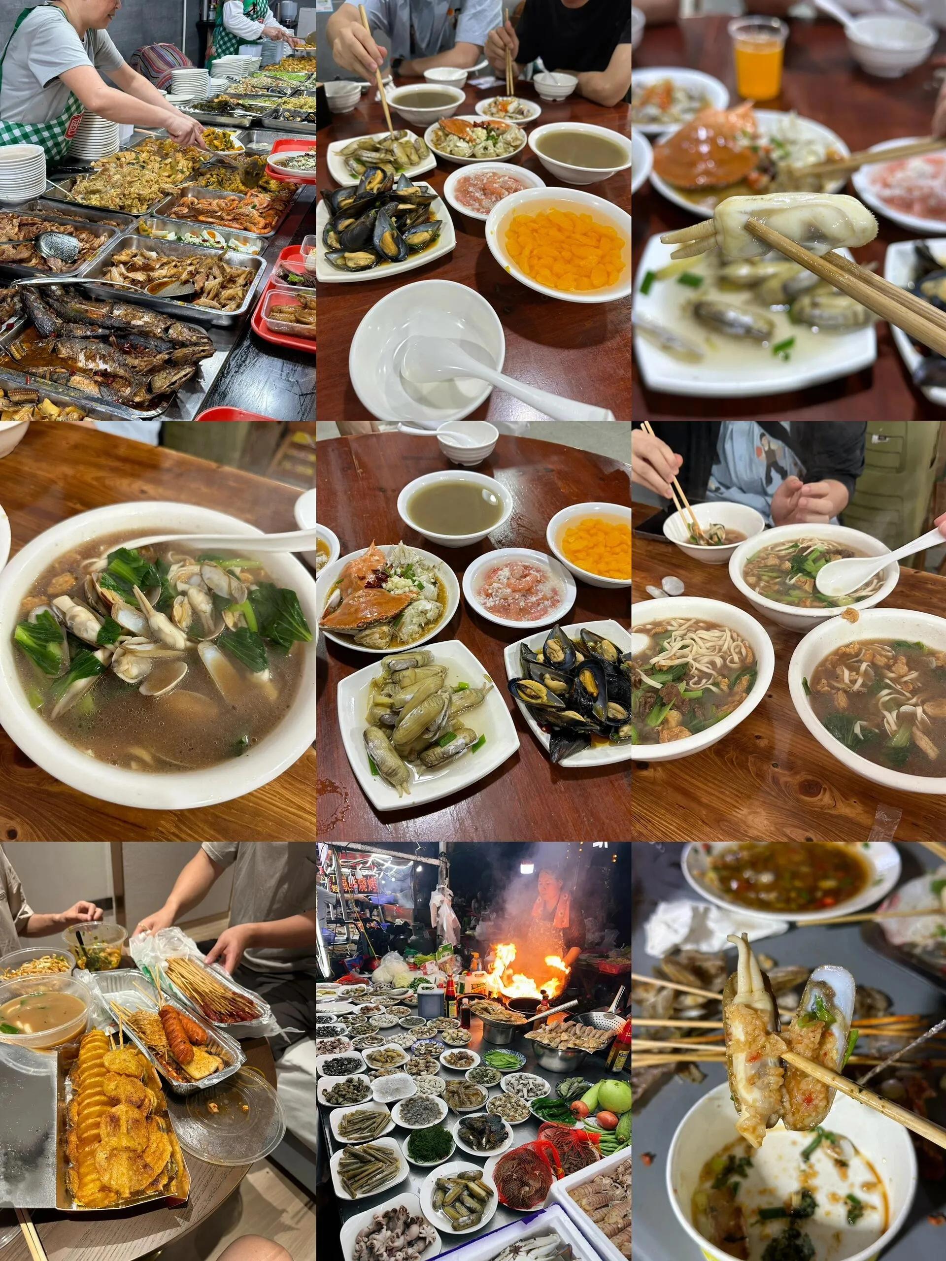 说到美食,虽然我们去的时候正值禁渔期,能吃到的海鲜不多,但仍然有不少当地特色美食值得一试。在蓬莱菜场附近,有很多当地早餐店,糖糕、凉糕、红糖馒头都是不错的选择。午餐我们去了步行街上的“丈母娘”快餐店,菜品种类丰富,很受欢迎。 晚上在石浦镇品尝了培培肉蟹煲,青蟹肉多且鲜美。 此外,象山最常见的要数海鲜面了,我们连吃了三天,不过味道好坏还是要看运气。