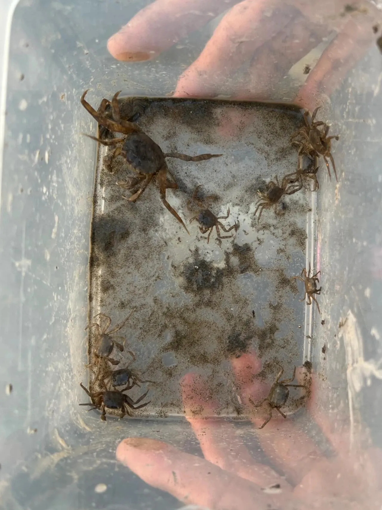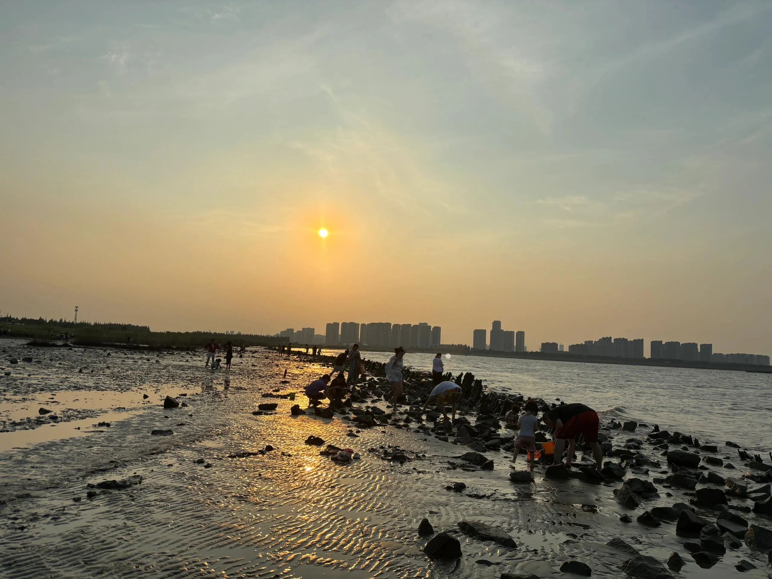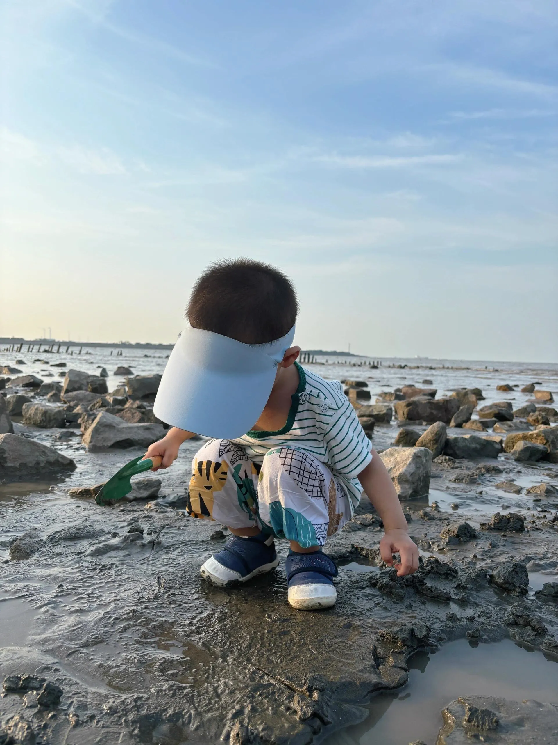 赶海区域人很多,各个年龄段的孩子都有。地面有不稳的石头、碎玻璃和贝壳渣,需要小心行走。石头下面和芦苇根附近有很多小螃蟹,孩子们可以自己抓,很有趣。芦苇丛旁有一棵树,可以在树下休息。附近没有看到水源和厕所,建议自带水。