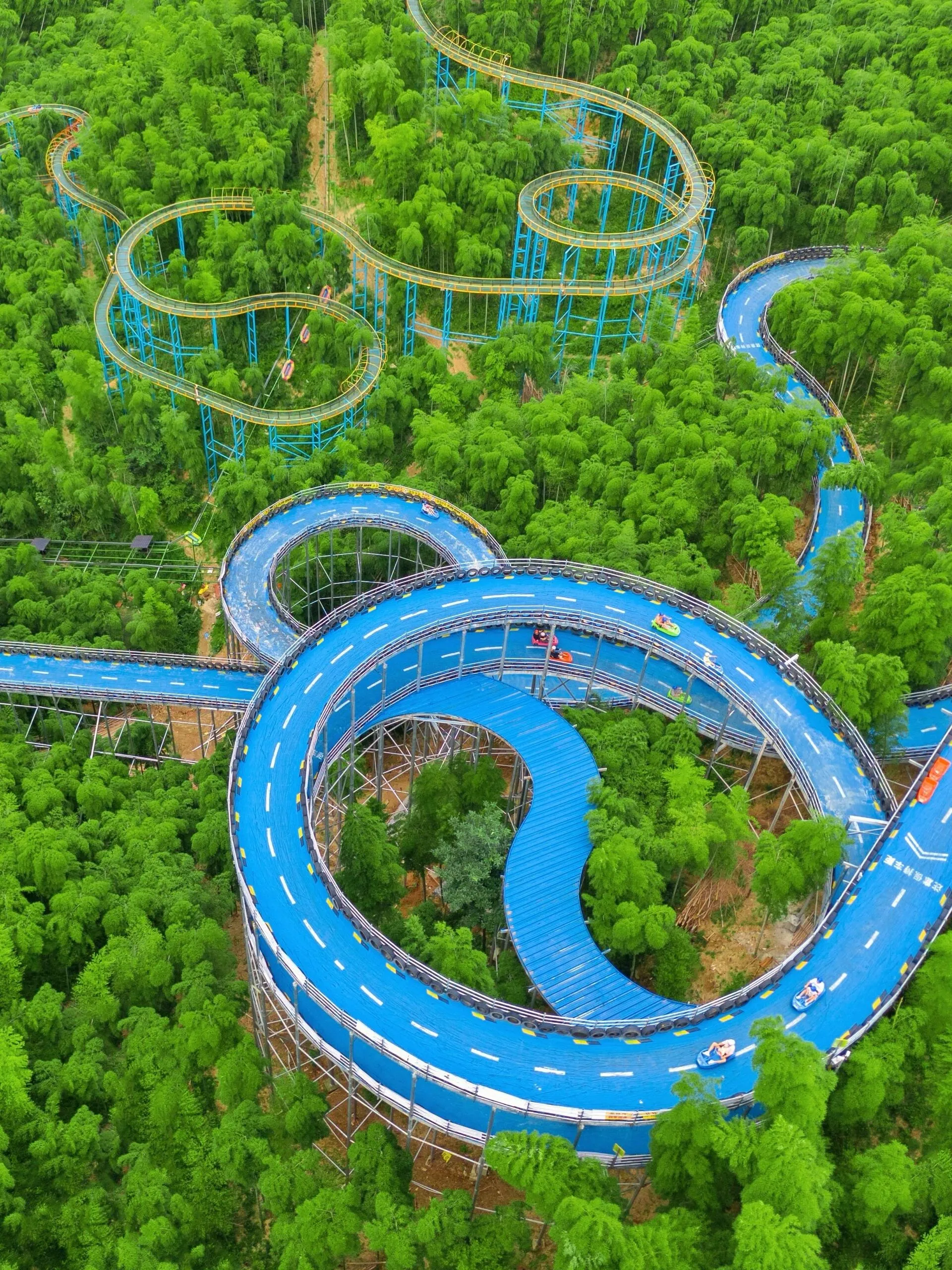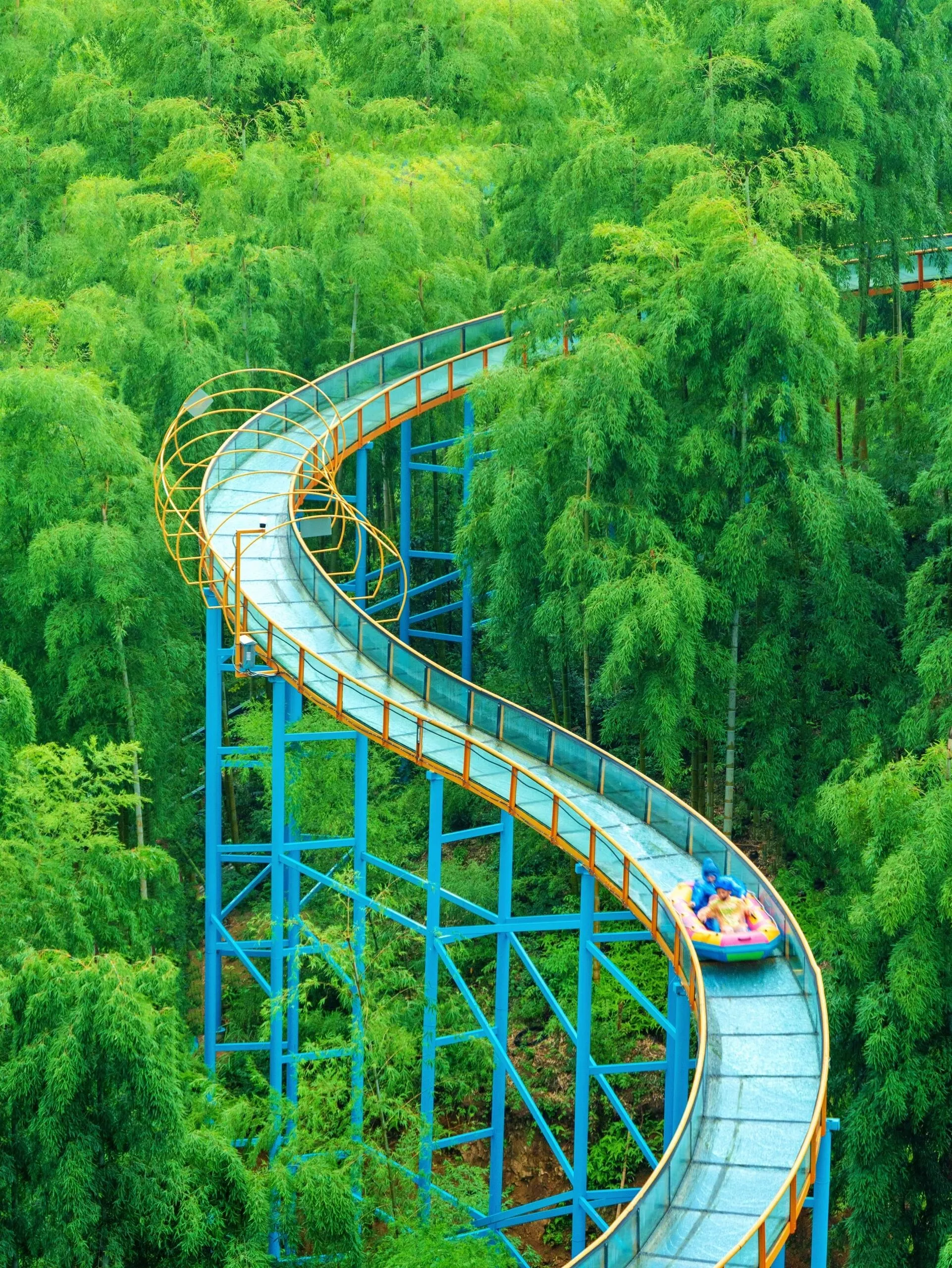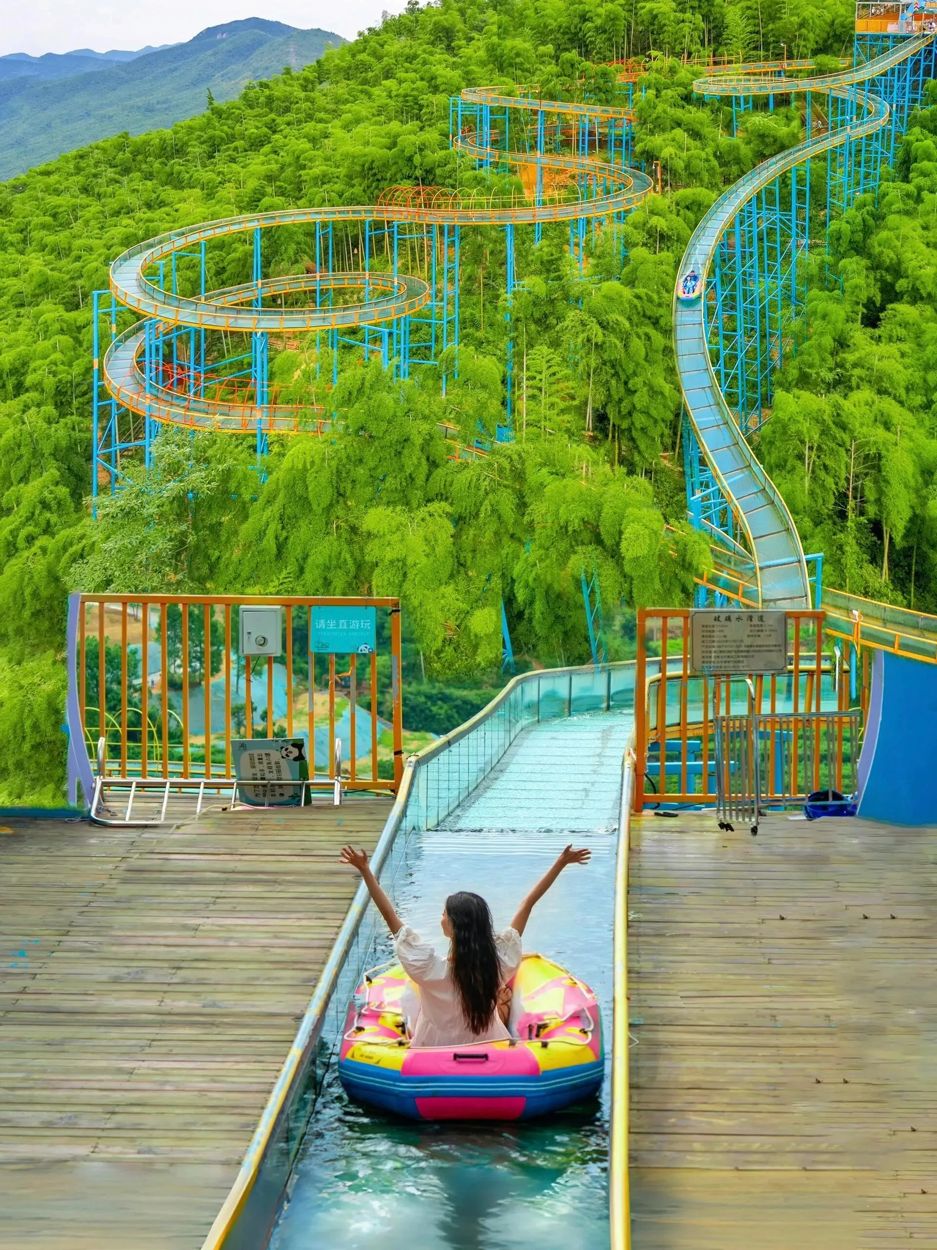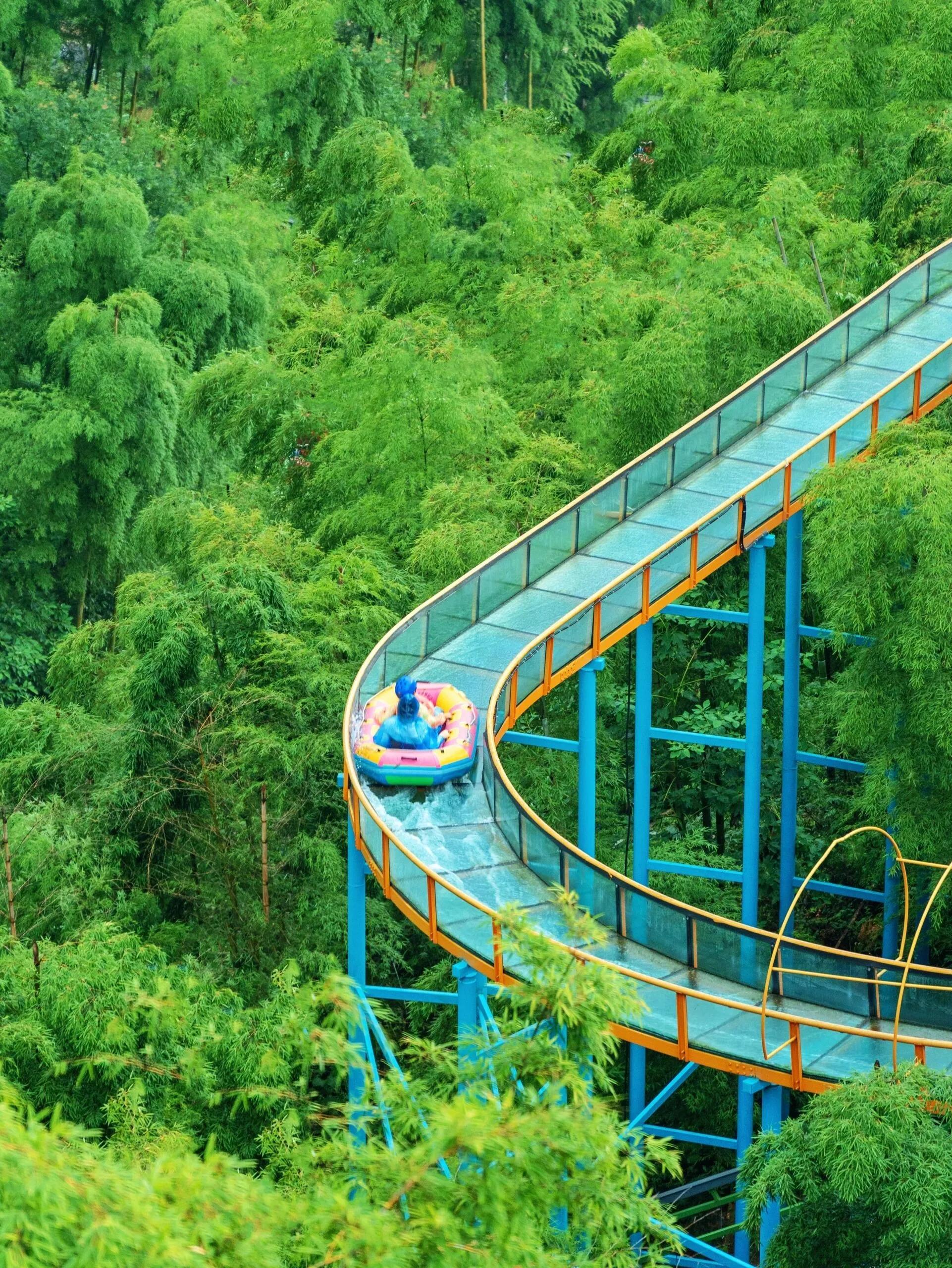 萌宠乐园 → 熊猫瓜铺 → 多巴胺水乐园 → 熊猫上山 → 熊猫村落 → 竹林穿越 → 竹间漂流 → 熊猫上山 → 天路飞车 → 竹林咖啡 → 大马戏