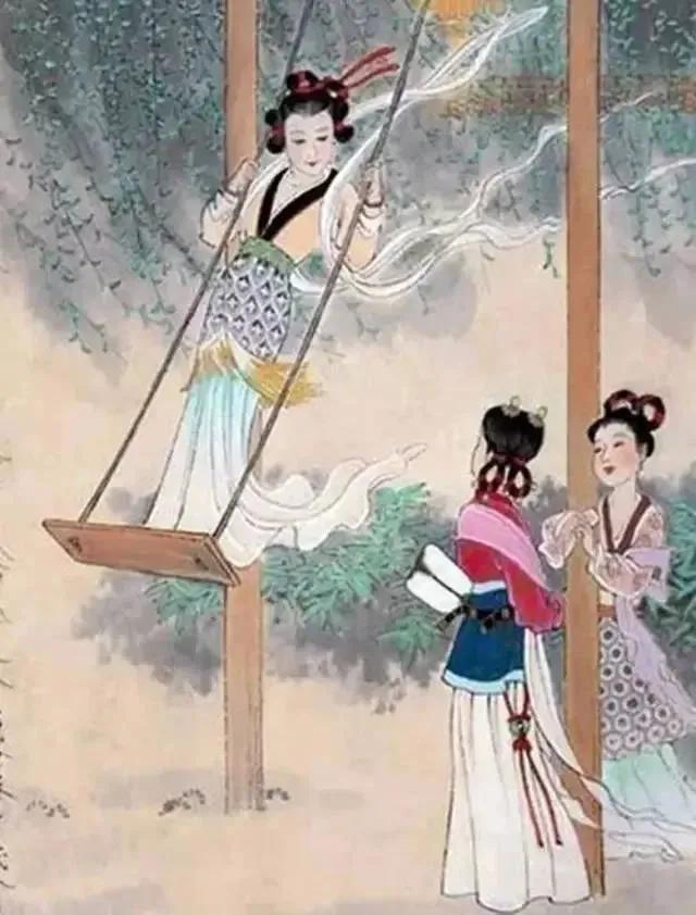 春天的花园里,李清照在荡秋千,累了,站起身来。