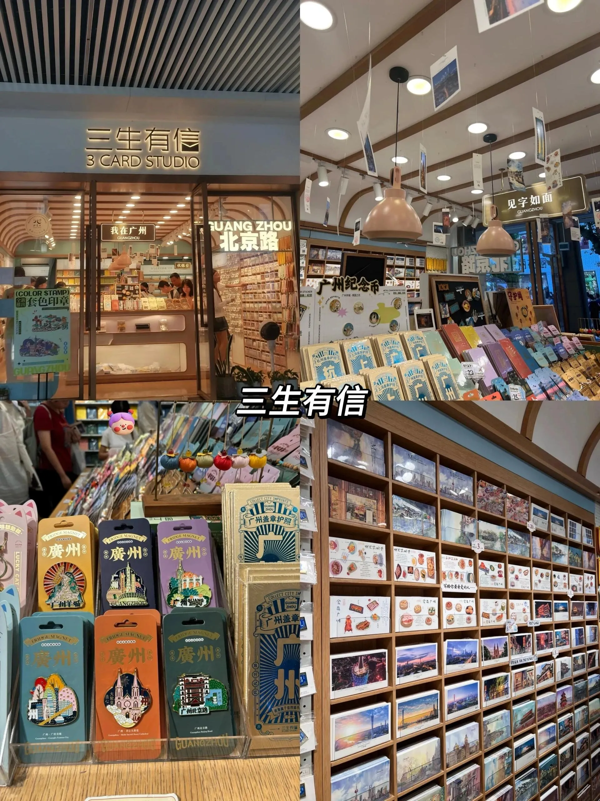 这家店以广州各种建筑造型的冰箱贴而闻名,还有许多其他文创产品,如明信片、徽章等。店内有各种各样的纪念礼品,人气很旺,氛围热闹。