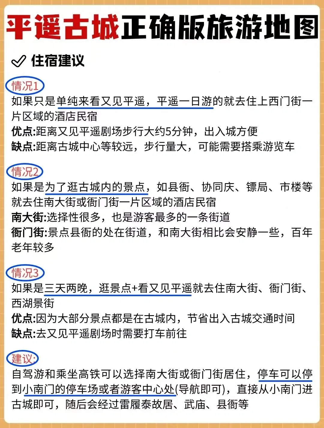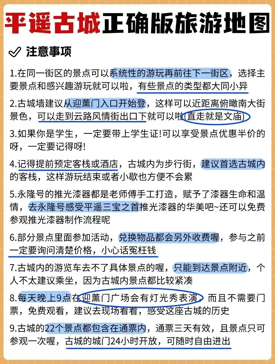 古城内景点集中,建议按街道逛览,避免走冤枉路。导游讲解请通过正规预约平台,确保安全可靠。进城预约、景点通票、又见平遥演出票及导游讲解都可以在平遥古城景区官方服务平台公众号上预约购买,非常方便。所有预约和门票购买都需要实名制,记得携带身份证件。不要轻信路边推荐的住宿或停车点,最好提前做好攻略,包括停车位置和进城路线。