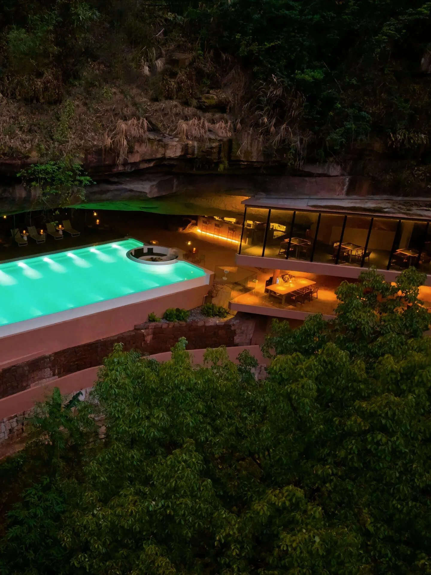 赤水匠庐·雅路古酒店由洞穴里的10户百年民居改建,共有25间客房,17个房型。大部分房间都被岩石环绕,配套设施包括岩洞瀑布泳池、岩洞火塘、岩洞咖啡酒吧、岩洞观景餐厅,还有氛围相当静谧的冥想空间。岩洞里的泳池正对着瀑布,公共区域的氛围感也是一绝。