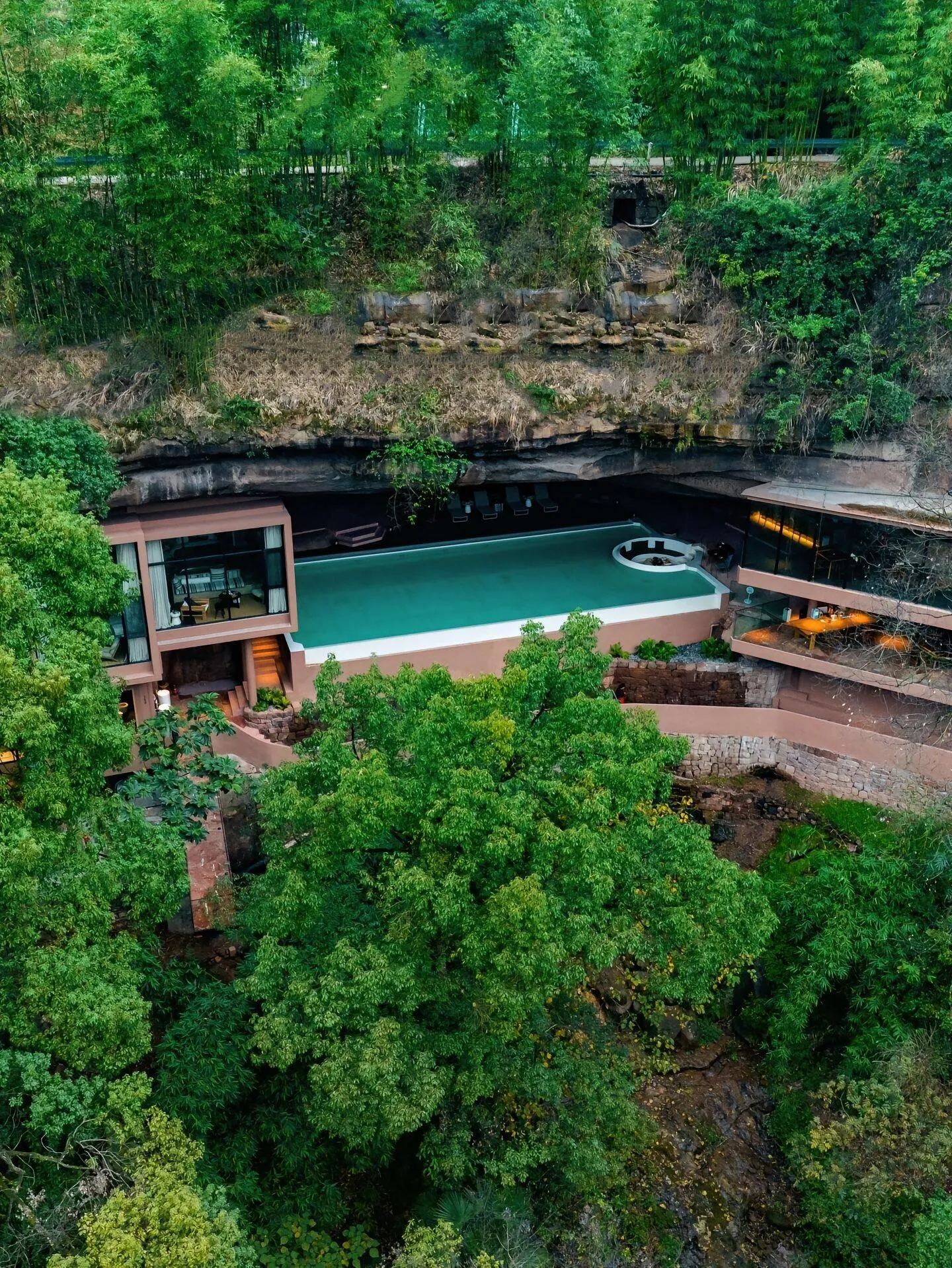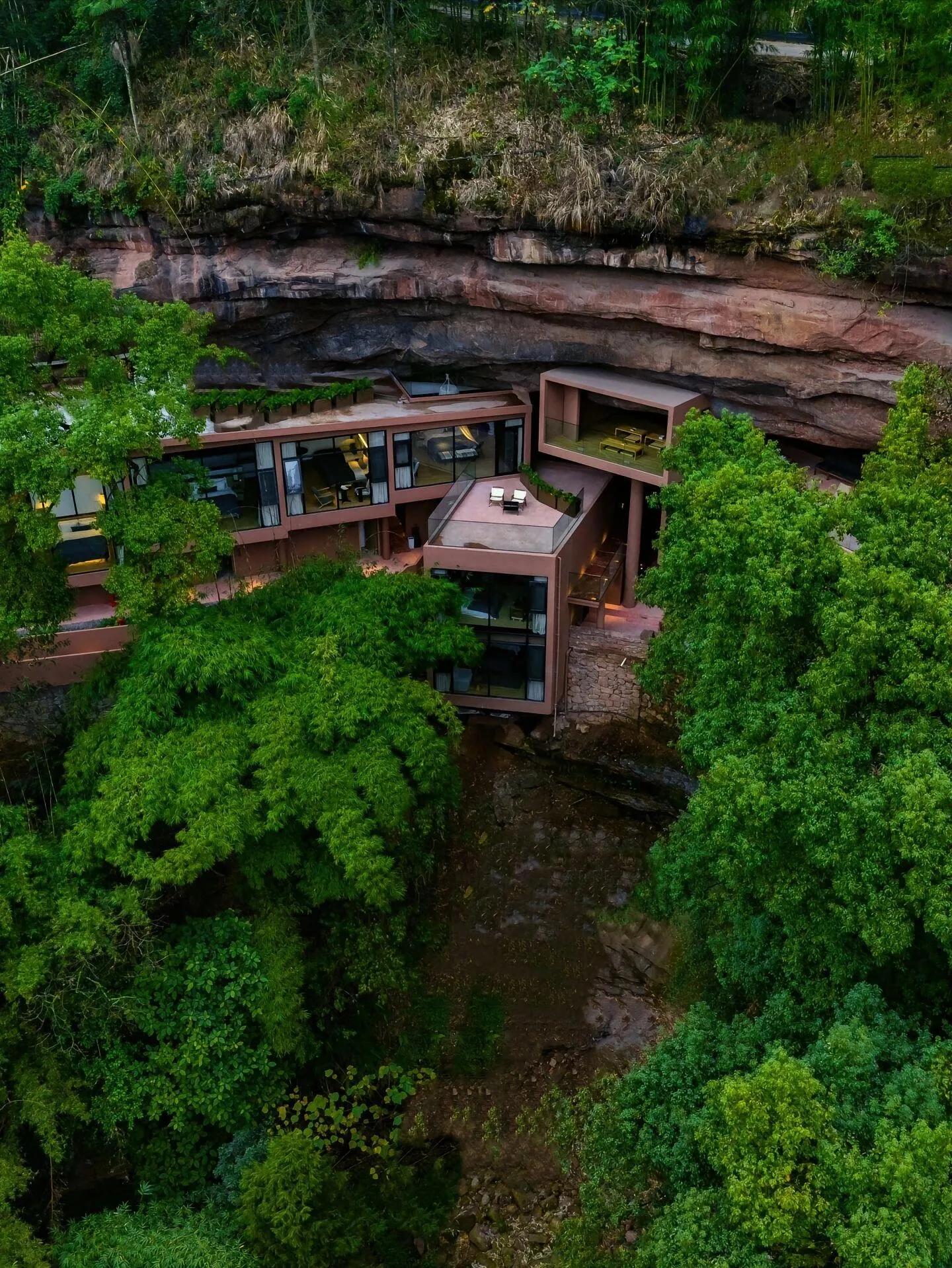 这里是一个被万亩竹林环绕的山崖岩洞酒店,在悬崖上的一个洞穴能修建出令人震撼的建筑,非常值得一去。酒店房间大部分都保留了天然岩石,不用出房间便能触摸到岩壁的岁月痕迹。