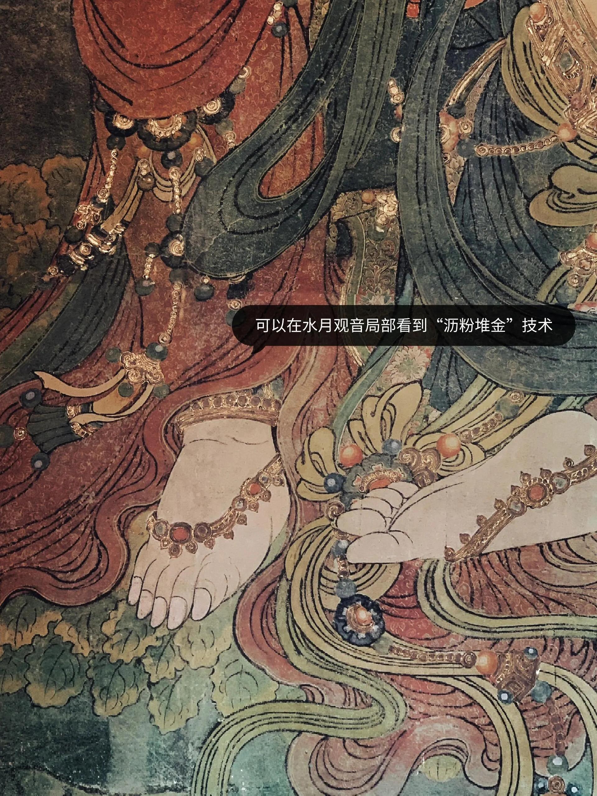 另一个令人惊叹的细节是水月观音的轻薄纱衣。高达3米多的水月观音衣袂飘飘,周身缠绕着一条朦胧的白色轻纱,纱上缀有一朵朵六菱花,每个花瓣由48根金线组成,细如蛛丝,精妙至极。