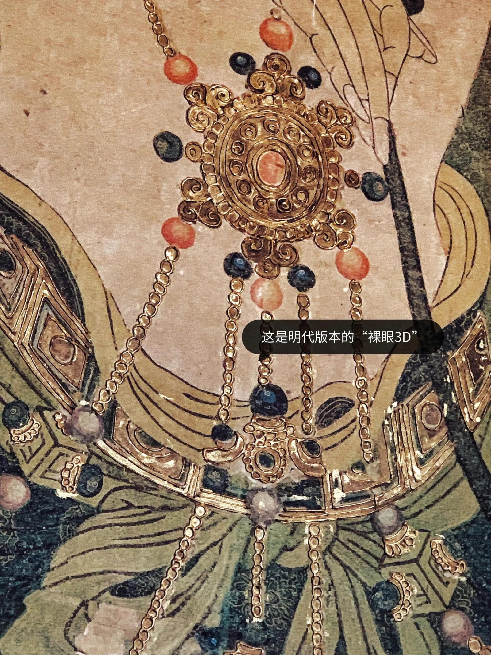 法海寺壁画的看点众多,其中最引人注目的是两大绘画“绝技”:沥粉堆金和叠晕烘染,这两种技法构成了所谓的“裸眼3D”效果。金粉堆砌使每一条轮廓线都呈现出浮雕般的立体效果,这是敦煌壁画或永乐宫壁画所不具备的特点。