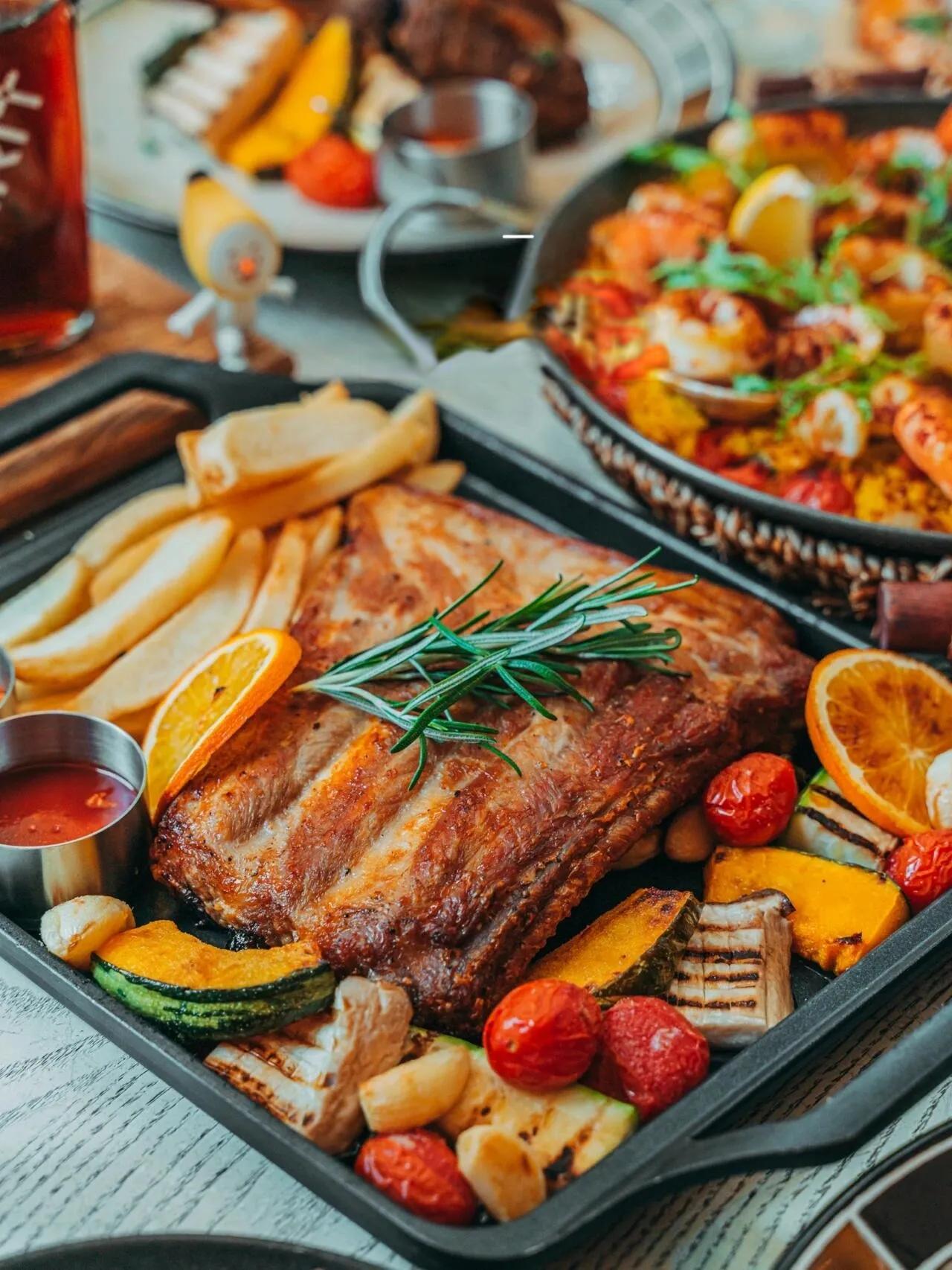 先说说西班牙猪肋排(128元)。这是用橡果喂养的黑猪制作的,跟西班牙火腿一样。一大块烤得油脂渗出,带着橡木果香,肉质嫩中带弹,香而不腻。搭配四周烤后的配菜一起吃,简直是大口吃肉的幸福。