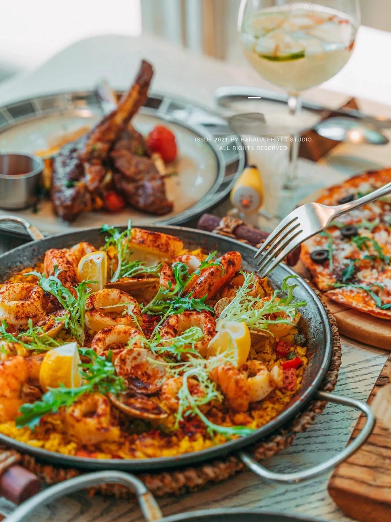 西班牙海鲜饭(158元)是喜欢硬米饭的朋友的首选。金黄的米饭上铺满了海鲜和蔬菜,大虾和鱿鱼格外吸睛。每粒米饭都很有嚼劲,吸收了海鲜和调料的精华,味道十足。